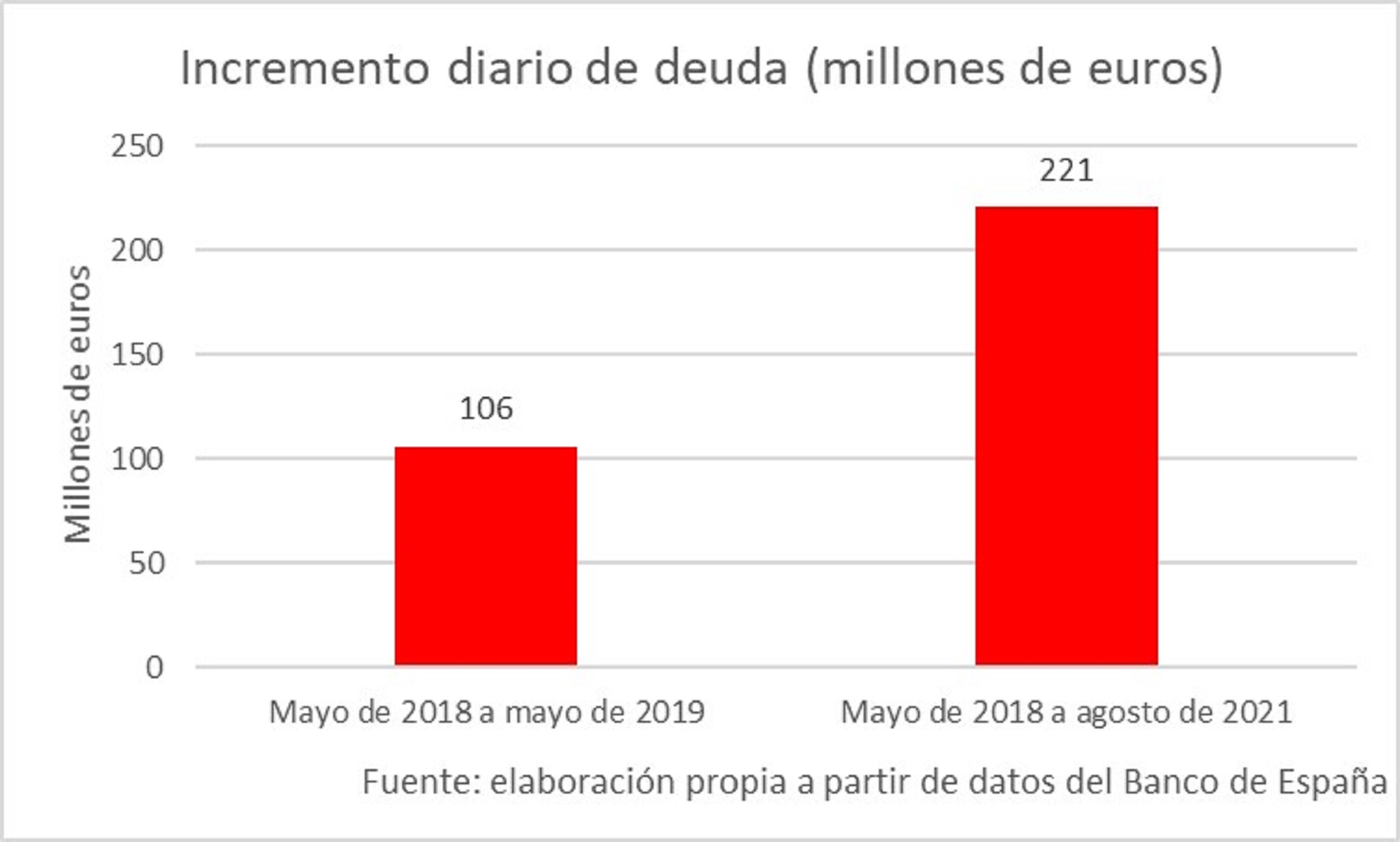 O visto de otra manera: en el primer año, la deuda se incrementaba a un ritmo de 105,99 millones de euros al día. Ahora, tras tres años de Gobierno de Sánchez, la deuda crece 220,61 millones de euros cada día.