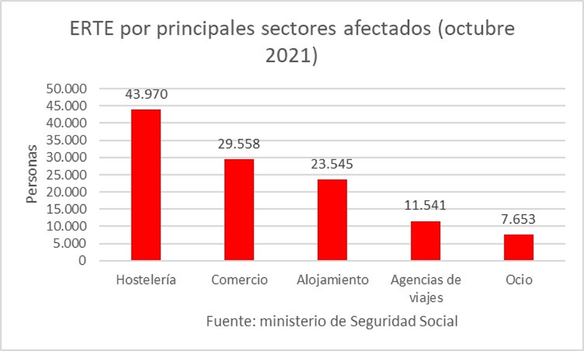 Todas estas actividades pueden tardar mucho tiempo en recuperarse si se mantienen las duras restricciones existentes. Si estas actividades concentran el 58,71% de las actuales situaciones en ERTE, es preocupante que el horizonte de recuperación de la total normalidad no se vea todavía cercano, sembrado de dudas y con una probabilidad cada vez más elevada después de que el verano no haya podido desarrollarse en condiciones completamente normales a efectos de campaña turística.