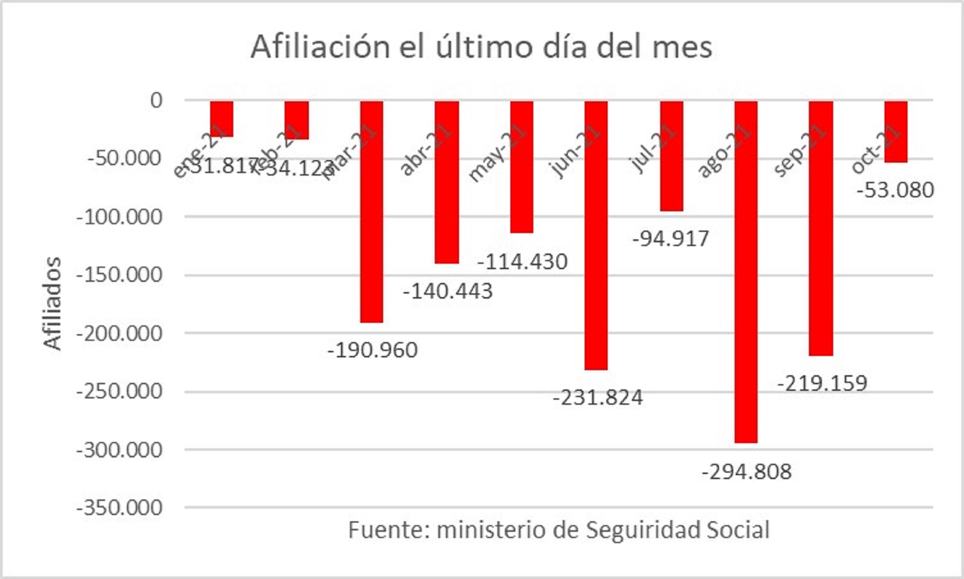 El último día del mes se perdieron 53.080 afiliados, tras la fuerte destrucción de empleos el último día de mes que se produce desde junio, cuando se encadenaron cuatro meses consecutivos con fuerte destrucción de empleo ese último día, con tres de esos mes con más de 200.000 empleos el último día del mes.
