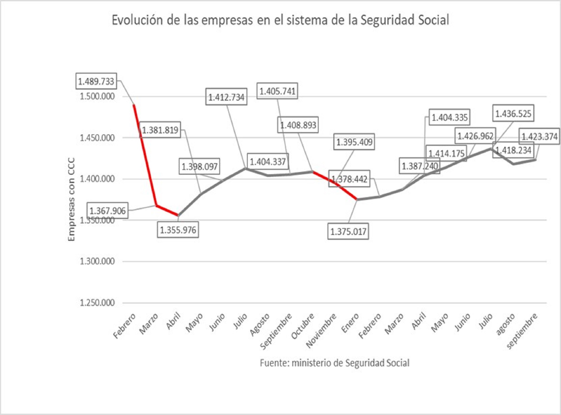 El número de empresas con código de cuenta a la Seguridad Social han descendido en 66.359 desde febrero de 2020. Es decir, son códigos de cotización de empresas cerradas, que no se han recobrado.