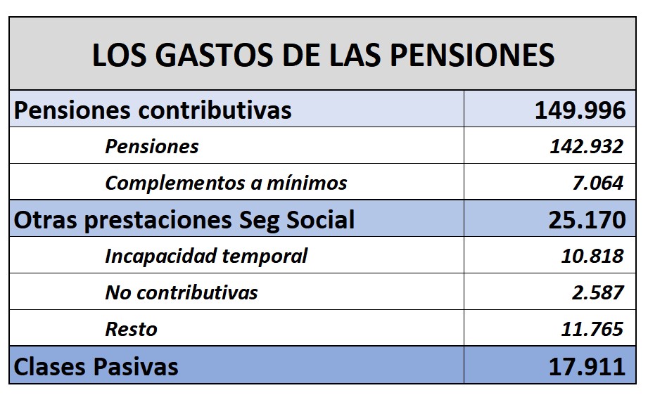 - En el otro lado del Presupuesto, el de los gastos, encontramos las siguientes partidas. En primer lugar, 149.996 millones en pensiones contributivas, de los que 7.064 millones corresponden a complementos a mínimos (que ya se abonan desde el Presupuesto ministerial)