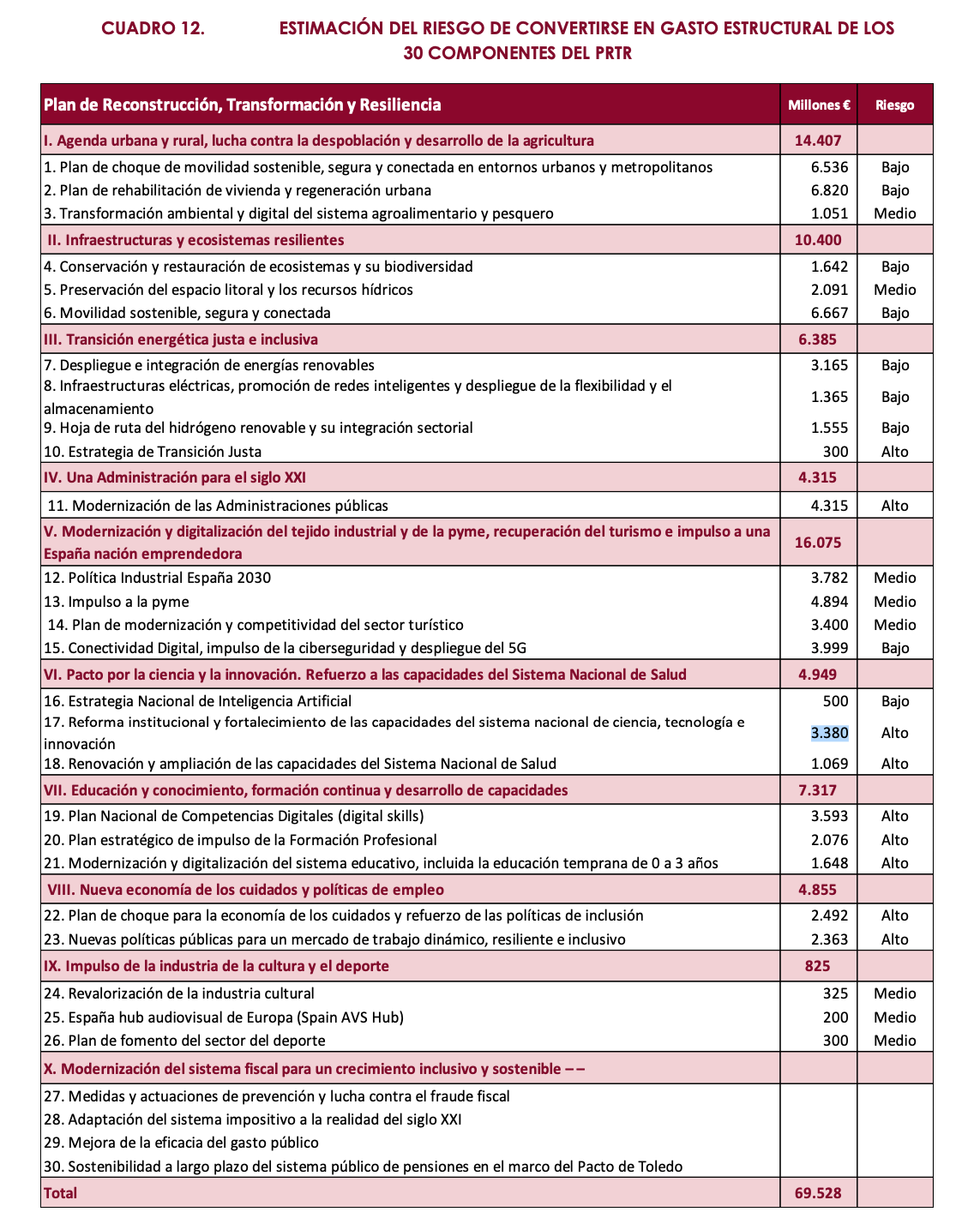 Además, la AIREF ha identificado otros epígrafes en los que se considera que hay un riesgo medio de que los gastos aprobados de manera provisional terminen convirtiéndose en capítulos permanentes de los presupuestos públicos. Es el caso de las "nuevas medidas de impulso a las pymes" (4.894 millones), la "política industrial España 2030" (3.782 millones) o el "plan de modernización y competitividad turística" (3.400 millones). En total, el gasto estructural crecería en 16.043 millones adicionales si estos apartados del plan de "rescate" acabasen convirtiéndose en nuevos presupuestos asimilados. Sumando esta partida a la anterior, hablamos de 37.279 millones de euros.