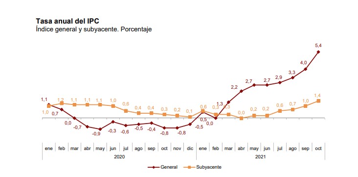 El Índice de Precios de Consumo (IPC) subió un 1,8% en octubre en relación al mes anterior y disparó su tasa interanual hasta el 5,4%, casi 1,5 puntos por encima de la tasa de septiembre y su nivel más alto en 29 años, debido el encarecimiento de la electricidad y de las gasolinas, según los datos publicados este viernes por el Instituto Nacional de Estadística (INE).
