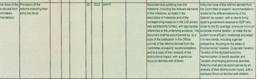 Dentro del punto "Establecimiento de un comité de expertos para la reforma tributaria", el Gobierno suscribe con Bruselas el "hito" de seguir "las recomendaciones del Comité de expertos" de María Jesús Montero que está analizando "los diferentes elementos de la sistema fiscal español, con el fin de acercar la variable ingresos públicos/PIB de España a la media de la UE".