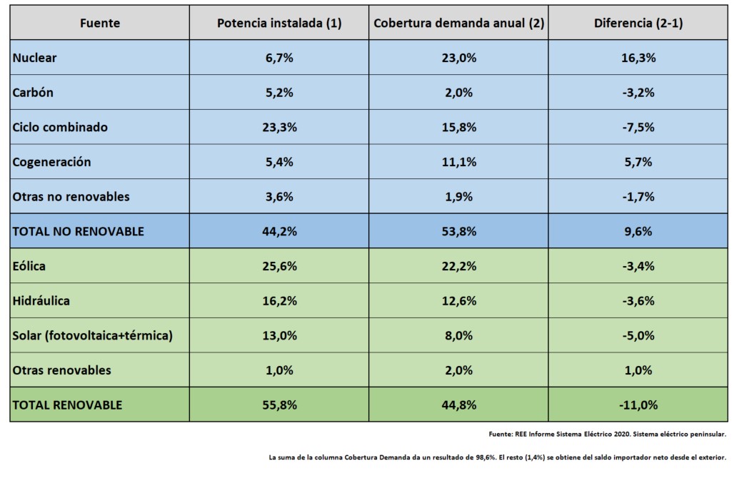 Como vemos en la tercera columna, no todas las tecnologías son iguales: el resultado es la diferencia entre la potencia instalada y la cobertura real (si es positivo, es que esa fuente de energía aporta más de lo que le toca; si es negativo, al revés).