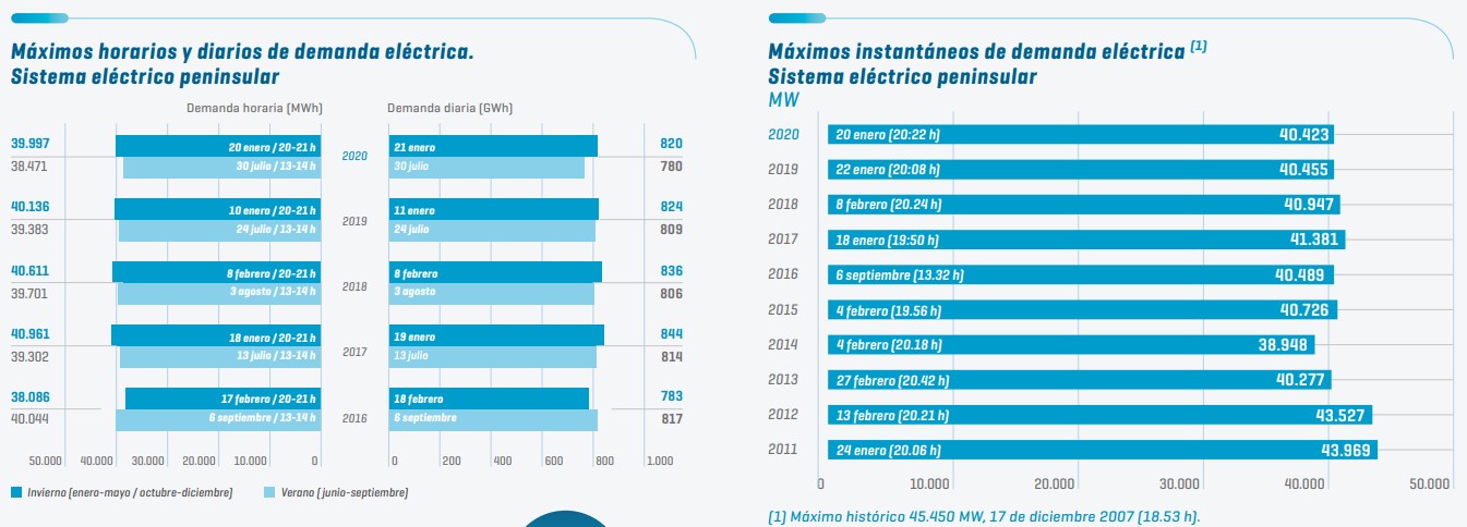 De hecho, estamos viendo una evolución paradójica. La demanda de energía eléctrica lleva más de una década sin alcanzar el pico de 2007. Y no por el Covid (era previsible que en 2020 cayera): en 2019 la demanda peninsular estaba en 249 TWh frente a los más de 260 TWh de 2007. Sin embargo, aunque la demanda total permanece estable (más bien a la baja pero estable entre 240-250 TWh) y los picos de demanda se mantienen en los 40.000-42.000 MWh en los días más fríos del invierno, la potencia instalada no deja de crecer: en menos de tres años, hemos pasado de menos de 100.000 MW en el sistema peninsular a los 105.638 con los que cerrábamos 2020.