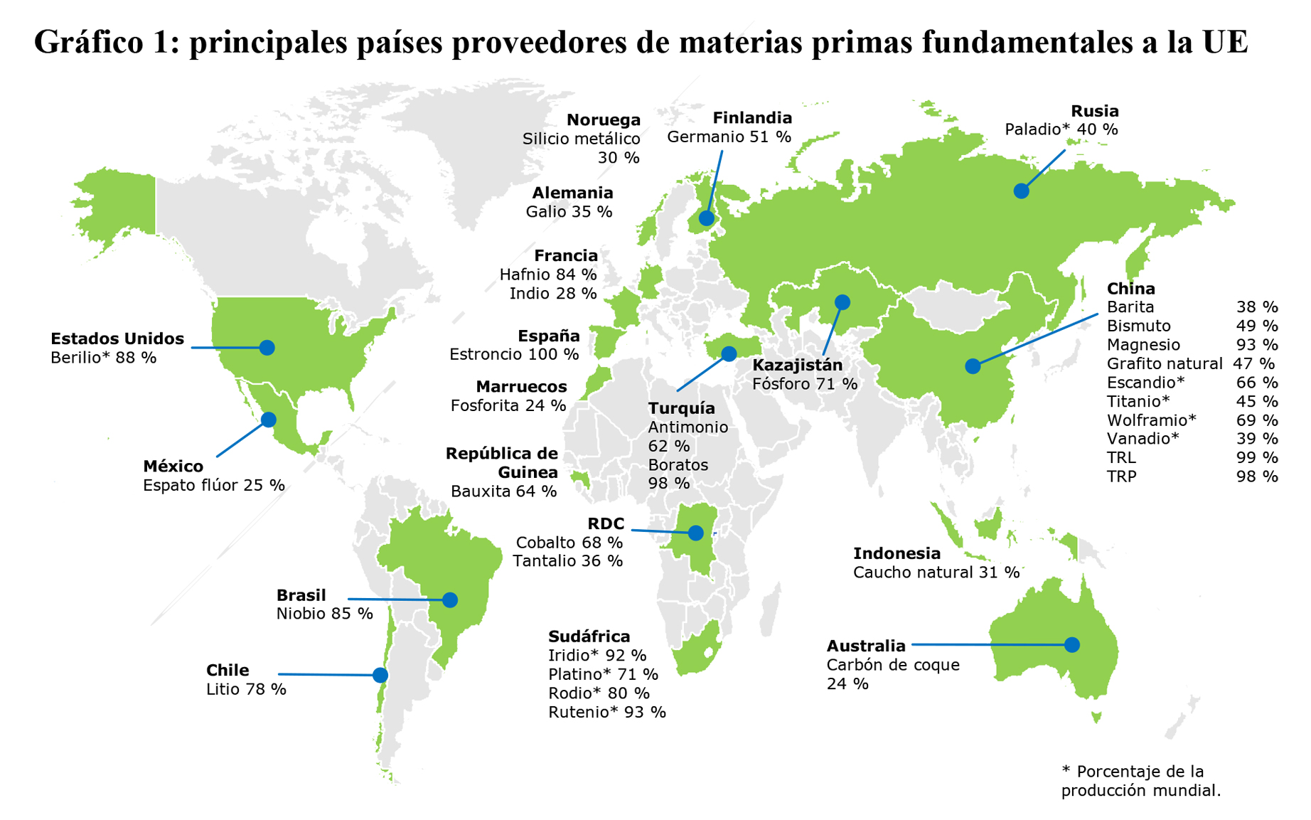 Por ejemplo, el 98 % de las tierras raras que importa la UE proviene de China; el 98 % del borato procede de Turquía; Sudáfrica suministra más del 70% del platino, iridio, rodio y rutenio y casi un 68% del Cobalto viene del Congo. Y el problema de los suministros será cada vez más grave. Sólo para las baterías de vehículos eléctricos, en el año 2030 necesitaremos hasta 18 veces más litio y 5 veces más cobalto. Del mismo modo, la demanda de tierras raras podría multiplicarse por diez de aquí a 2050, según cálculos de la UE.