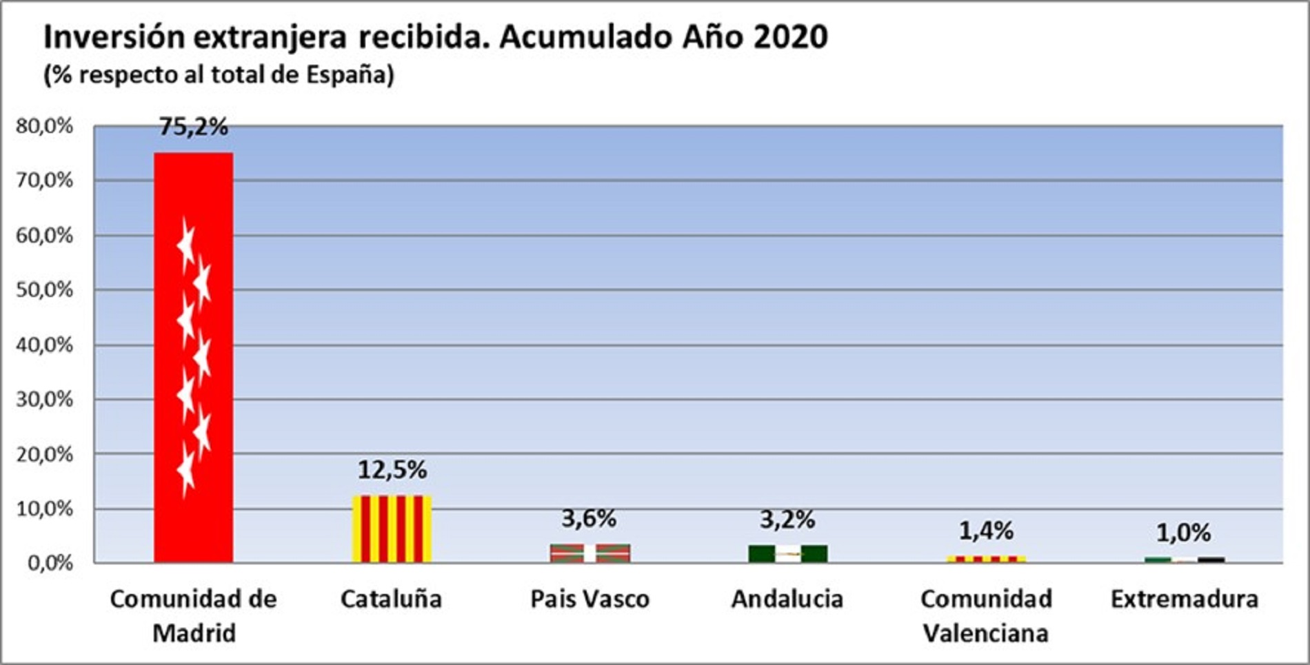 Esa política de libertad le permite a Madrid atraer el grueso de la inversión extranjera, como muestra el dato de 2020 (último año completo), donde en Madrid se concentran las tres cuartas partes de la inversión recibida.