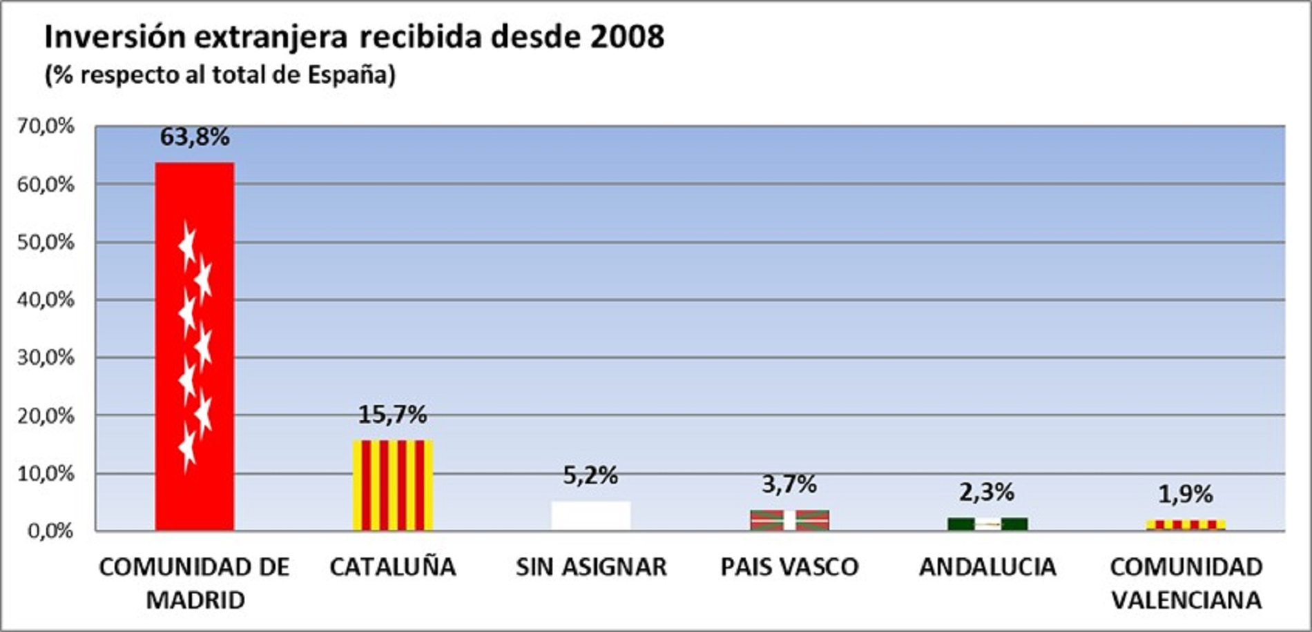 Y ese porcentaje de inversión extranjera ha sido creciente, pues desde 2008 Madrid recibe el 63,8% y en el último año ha recibido casi doce puntos más, lo que demuestra que la confianza en la política económica de Madrid por parte de los inversores y del conjunto de agentes económicos es cada vez mayor. Paralelamente, vemos cómo las políticas intervencionistas que defiende la izquierda, que son las aplicadas en Cataluña, hacen que la región catalana pierda gran parte de la inversión que recibía del exterior.
