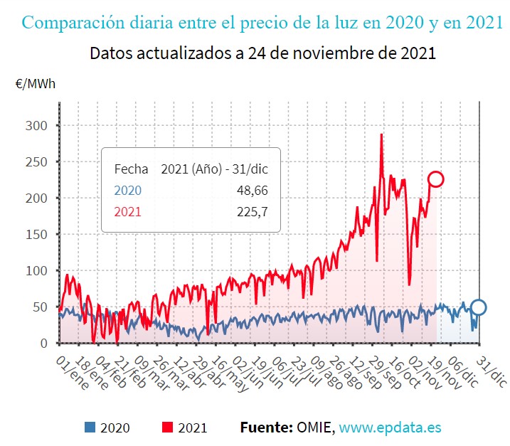 La luz sigue sin dar tregua a los consumidores españoles y el precio del megavatio hora suma siete días por encima de la insólita barrera de los 200 euros. En concreto, la electricidad alcanzará este miércoles los 225,70 euros de media, lo que supone el duodécimo máximo histórico en el pool.
