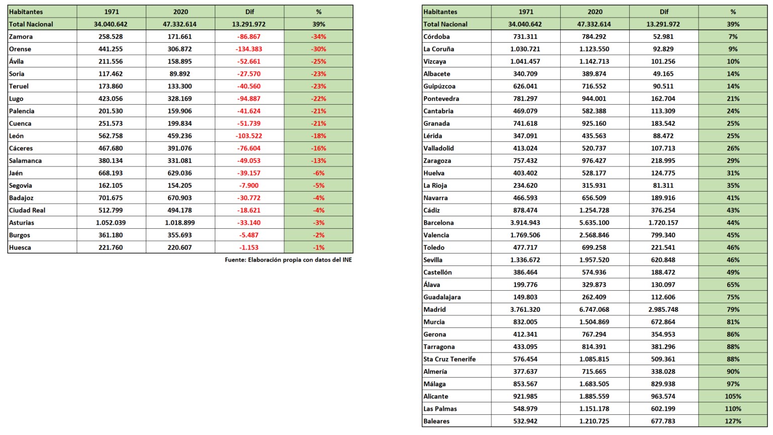 Tomamos el 1 de enero de 1971 y 2020, para que no nos afecten los posibles efectos de la pandemia. En 18 de las 50 provincias españolas (no incluimos Ceuta y Melilla porque su pequeño tamaño podría distorsionar la comparación), la población ha descendido en este medio siglo. Zamora y Orense encabezan este triste ranking, con caídas de más del 30% en el número de habitantes desde 1971.