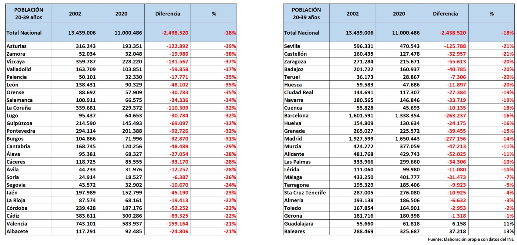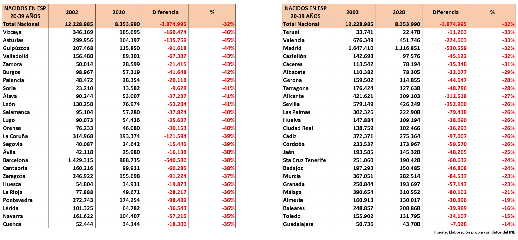 Esta segunda tabla muestra el número de residentes en cada provincia de entre 20 y 39 años nacidos en España. De 2002 a 2020, todas las provincias han perdido más del 14% de población en este grupo demográfico. Con una decena larga por encima del 40% de caída (Vizcaya y Asturias cerca del 50%): estas provincias tienen la mitad de jóvenes nacidos en España ahora que en 2002. No hablamos de tanto tiempo, son apenas dos décadas. Pero el cambio demográfico es brutal. Pocas veces se habrá visto algo así en la historia de un país. Y sí, era algo que podía anticiparse viendo las cifras de natalidad de la década de los 80 y los 90, pero incluso así llama la atención. Con un añadido: la tabla no la encabezan las provincias de la llamada "España vacía", sino otras en las que no siempre nos fijamos cuando vemos las tendencias demográficas (Vizcaya, Asturias, Guipúzcoa o Valladolid).
