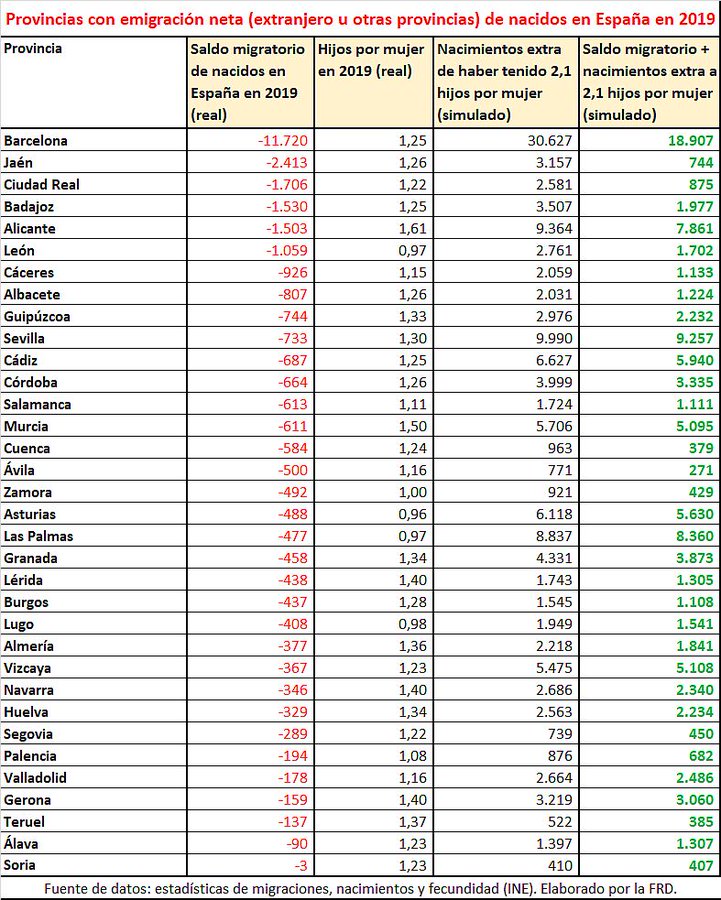 En esta tabla de Renacimiento Demográfico, nos hacen un apunte interesante: provincias españolas en las que ha habido emigración neta de personas nacidas en España en 2019 (por cierto, la primera es Barcelona).