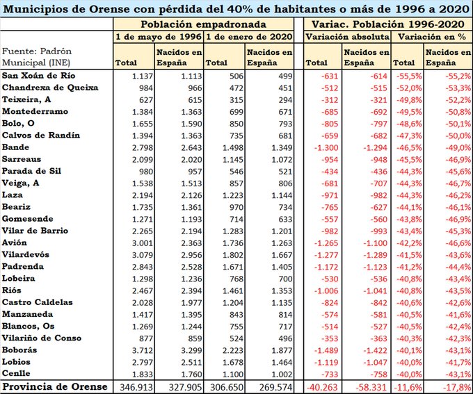 Por último, un ejemplo particular que sirve como caso ilustrativo de una tendencia más general. Es una tabla con los municipios de la provincia de Orense que han perdido más del 40% de su población en los últimos 25 años.
