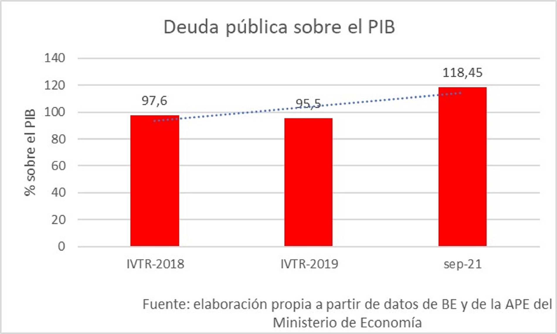 Si tomamos la deuda de final de 2020 (1,345 billones) y le sumamos el crecimiento del PIB que prevé como déficit el cuadro macroeconómico del Gobierno, la previsión de deuda absoluta para el cierre de 2021 es de 1,447 billones de euros, equivalente a un 119,69% del PIB.
