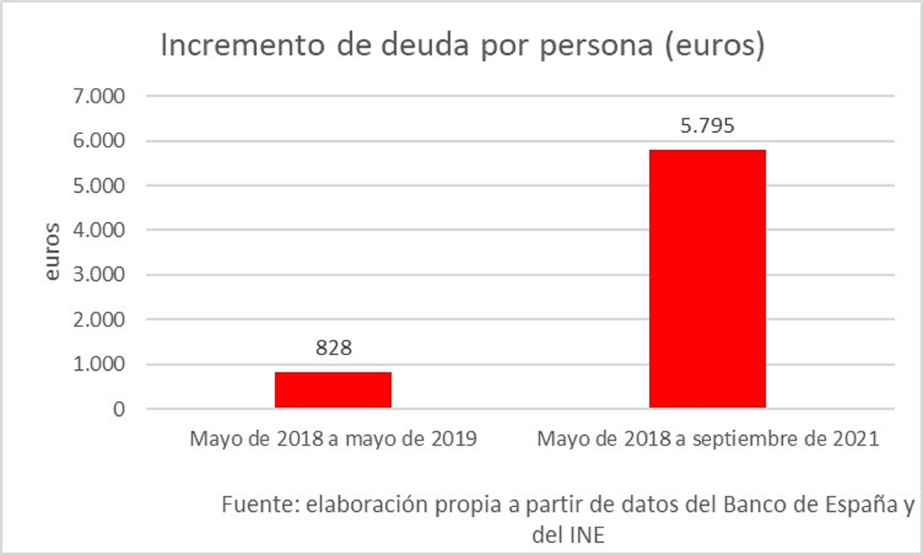 Así, si durante el primer año creció la deuda por persona en 828,03 euros, en los tres años de mandato de Sánchez la deuda por persona ha aumentado en 5.795 euros, casi siete veces el incremento del primer año.
