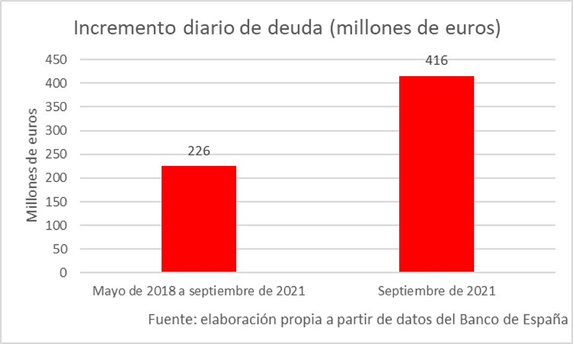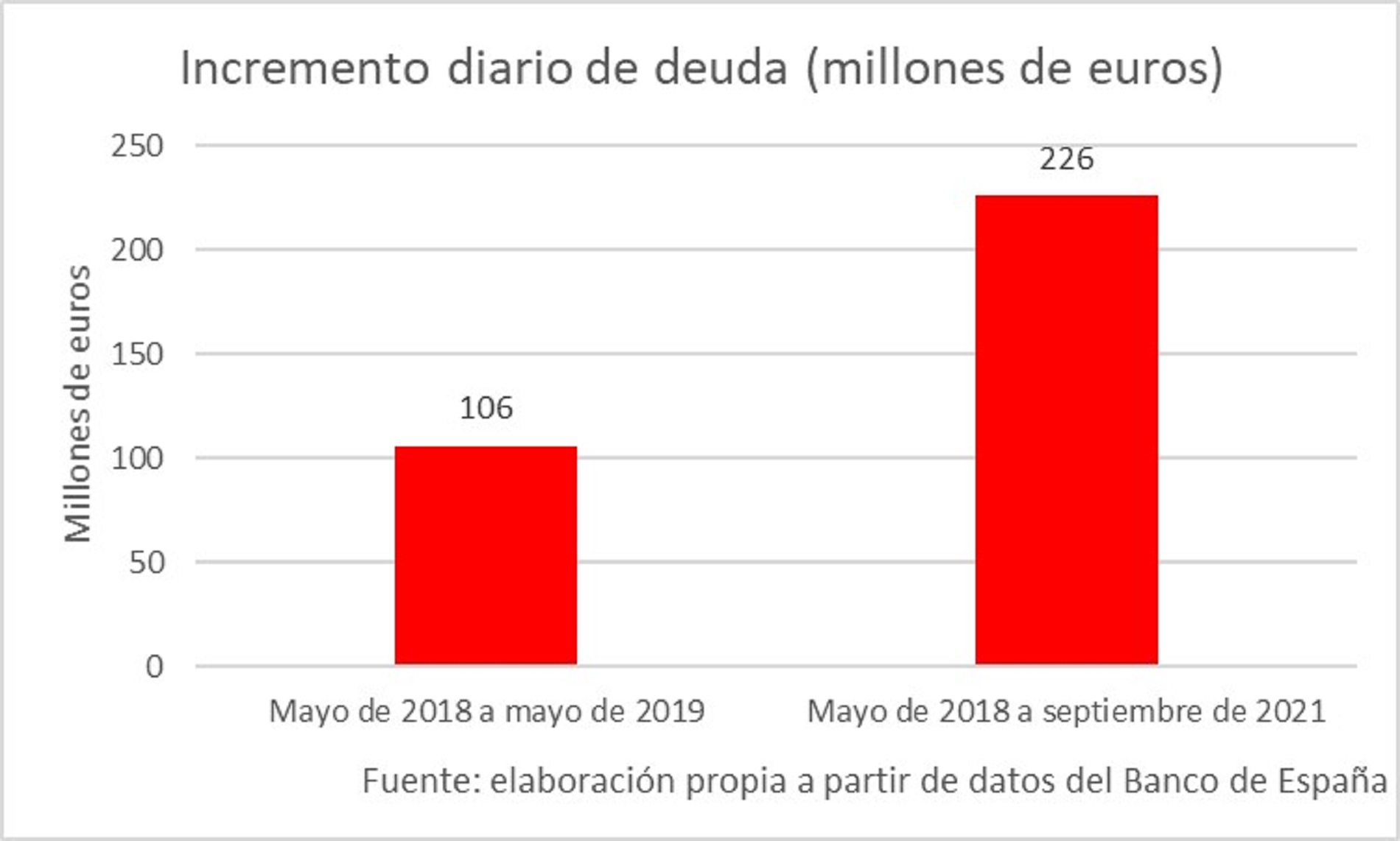 O visto de otra manera: en el primer año, la deuda se incrementaba a un ritmo de 105,99 millones de euros al día. Ahora, tras tres años de Gobierno de Sánchez, la deuda crece 225,75 millones de euros cada día.