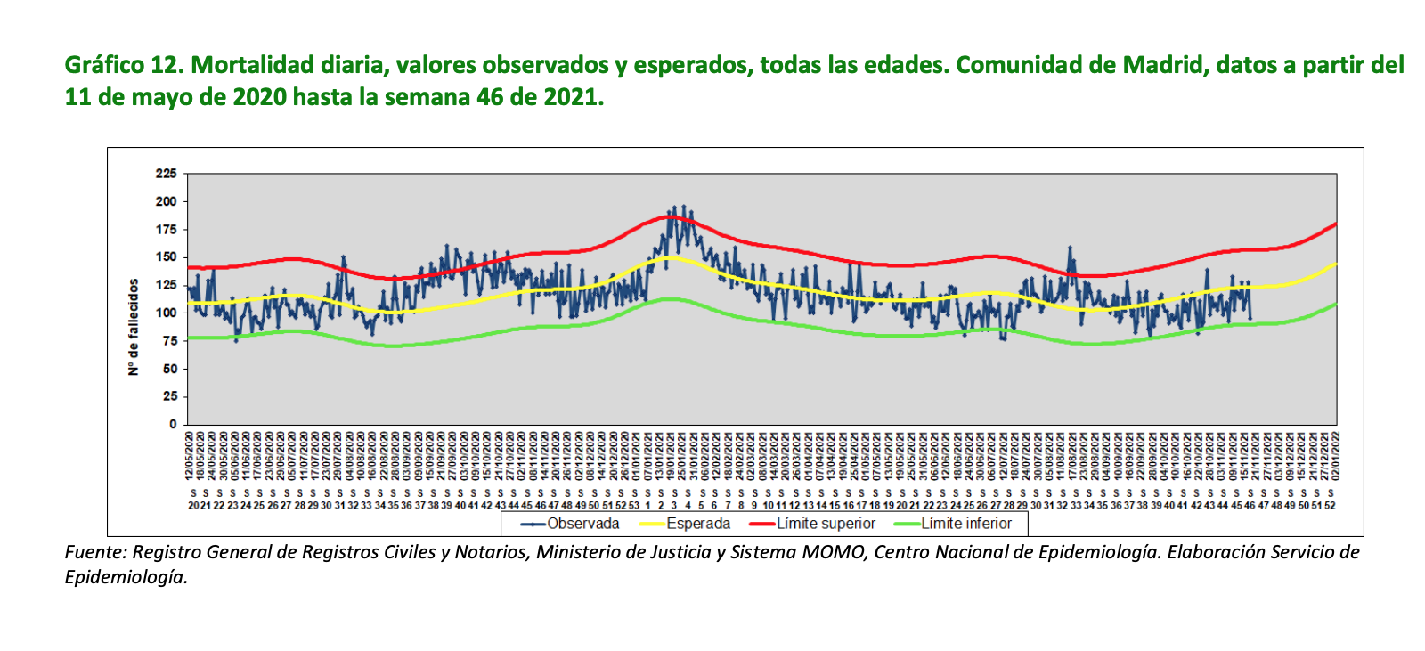 Fijémonos primero en los indicadores que miden la mortalidad diaria. Durante el último mes, Madrid ha registrado 2.805 fallecimientos, frente a los 3.171 que cabría esperar de acuerdo con los patrones habituales. De modo que no solo no hay exceso de mortalidad, sino que las defunciones registradas en Madrid están claramente por debajo de la media de los últimos cinco años (alrededor de un 11% menos).