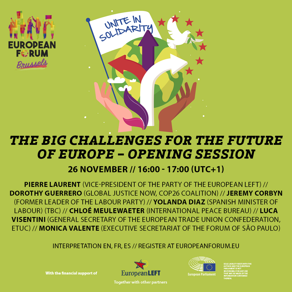 Este foro, organizado desde Bruselas, aglutina distintas charlas y encuentros a lo largo del año con líderes de la izquierda comunista y ecologista del continente. En la jornada de apertura de una nueva serie que tuvo lugar el pasado viernes, Díaz participó por videoconferencia para hacer un llamamiento a "superar el titubeo e impotencia", decía, frente al miedo, para "ofrecer políticas que aporten tranquilidad y certeza" a los ciudadanos.