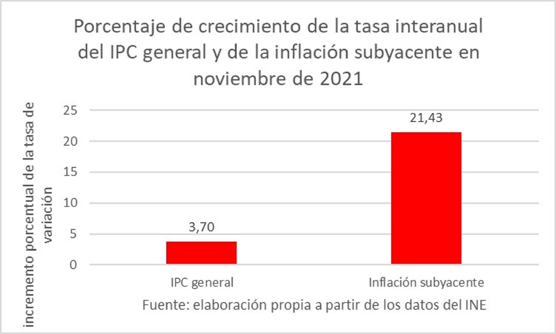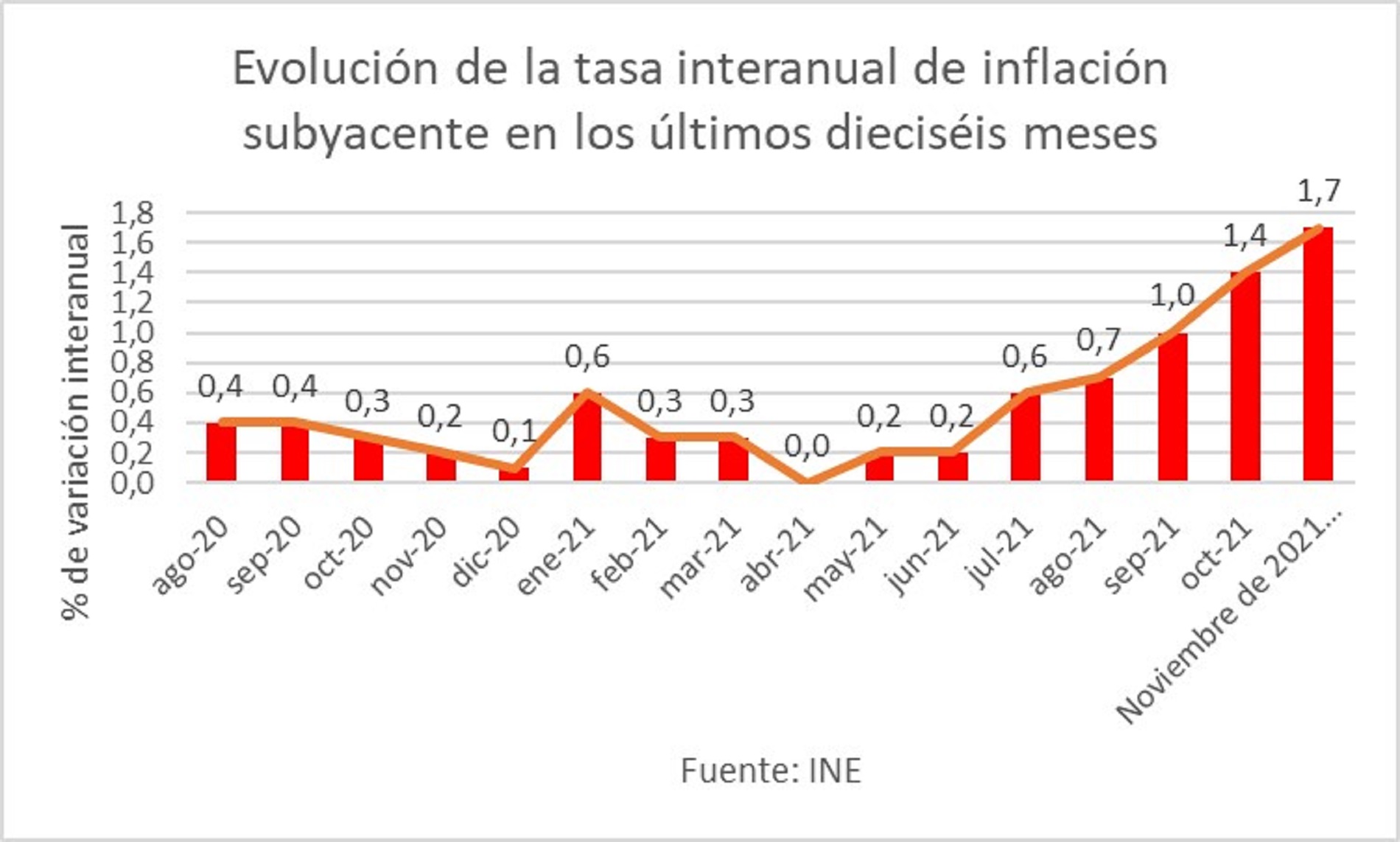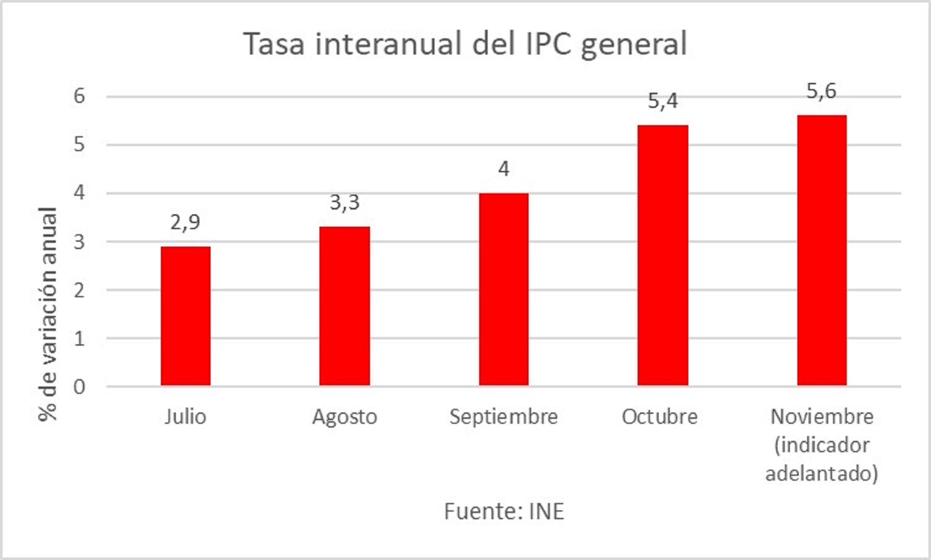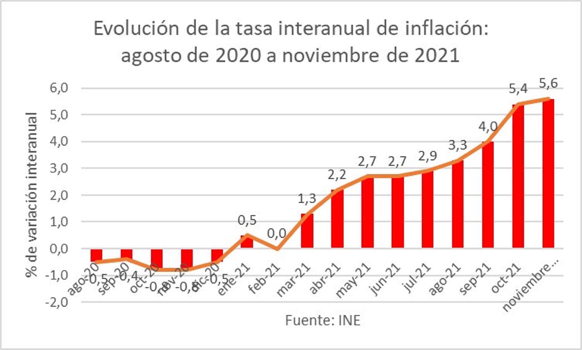 Desde noviembre del año pasado se está produciendo una escalada de la tasa anual de inflación, subiendo desde el -0,8% interanual de noviembre de 2020 hasta el 5,6% de este mes de noviembre, con un pequeño respiro que reflejó el índice en el pasado mes de febrero, donde se aplanó ese mes para crecer, al mes siguiente, 1,3 puntos, para continuar incrementándose en los meses restantes.
