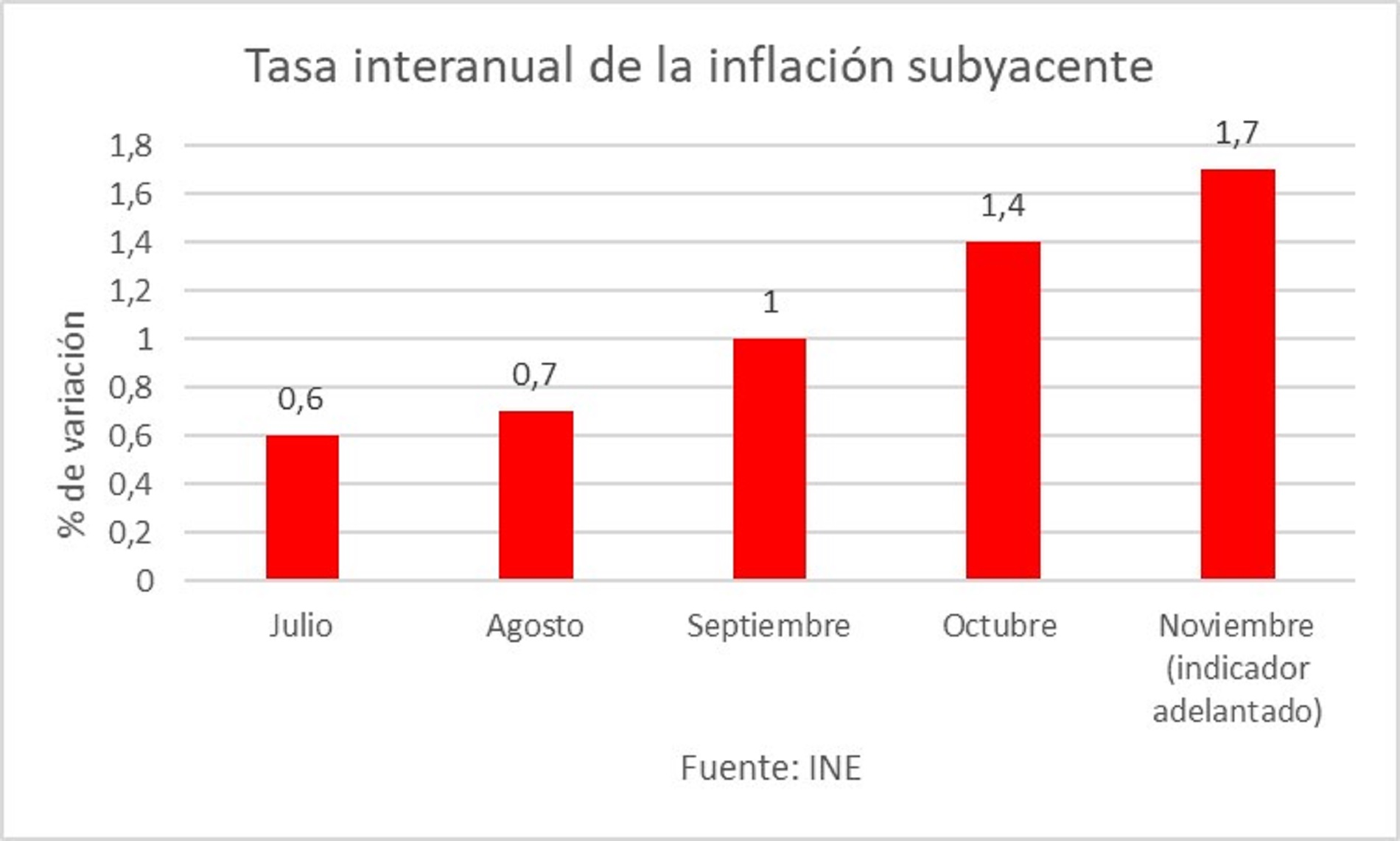 De hecho, al analizar la subyacente desde hace un año, vemos cómo se corrobora el alza generalizada de precios sin el impacto de alimentos no elaborados ni de los precios de la energía. Si en abril la tasa interanual de la subyacente era 0%, ahora es 1,7 puntos superior, con un 1,7%, con repunte intenso desde julio. Por tanto, no se trata solo del terrible incremento del precio de la energía que, como ya vimos hace unas semanas, en más de un 55% se debe a costes regulados e intervenidos, no al mercado, sino que empieza a haber una presión inflacionista generalizada.