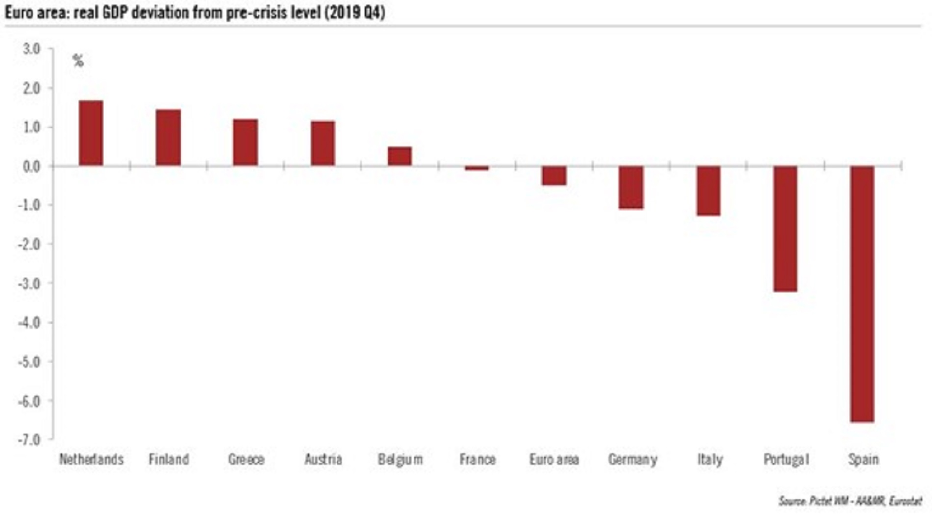 Los datos de PIB hablan por sí solos: España es el país europeo que más lejos está de recuperar los niveles pre-crisis —es decir, cogiendo los datos del cuarto trimestre de 2019 como referencia—, mientras que otros países, que hasta hace poco eran la "oveja negra" de Europa, como es el caso de Grecia, ya tienen niveles de riqueza 1% superiores a los de entonces.