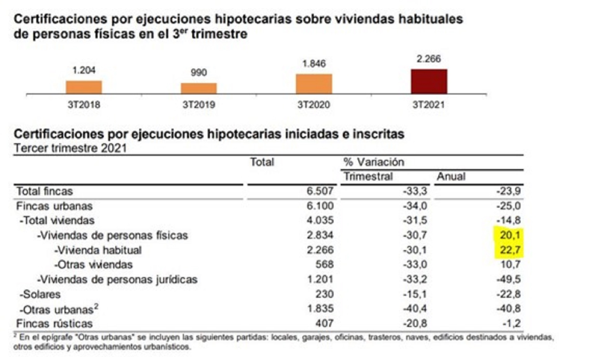 ¿Y los hogares? Tampoco se libran de indicadores preocupantes. Es cierto que el crédito mantiene una evolución razonable y que la tasa de morosidad continúa en niveles históricamente bajos, pero la semana pasada conocimos un dato ciertamente preocupante: las ejecuciones hipotecarias de viviendas habituales están aumentado a un ritmo del 22% anual .... y ¡¡¡del 123% con respecto al tercer trimestre de 2019!!!!