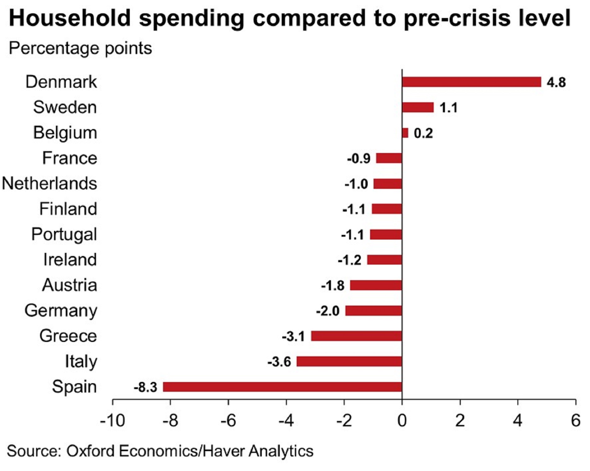 Como consecuencia de lo anterior, la brecha que se está abriendo entre nuestro país y el resto de Europa en términos de consumo doméstico en los hogares es incluso mayor que la que vemos en el PIB.