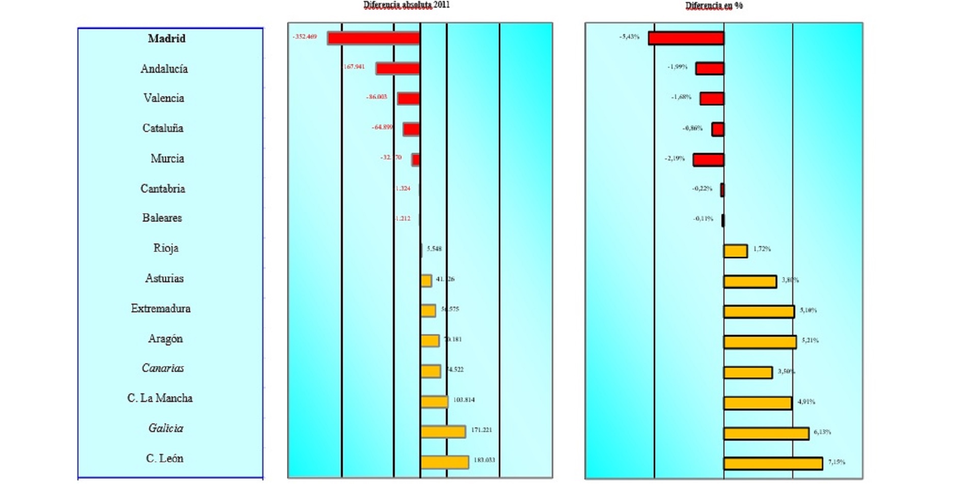 Eso se debe a que Madrid es la que más población real pierde respecto a la ajustada, pese a que el envejecimiento de la población madrileña ha hecho que pierda menos que en los primeros años del sistema. Si entonces perdía 352.449 habitantes —en términos de financiación sanitaria llegaban a los 600.000—, que suponía un 5,43% menos de financiación en 2011 —primer año liquidado del nuevo sistema—…