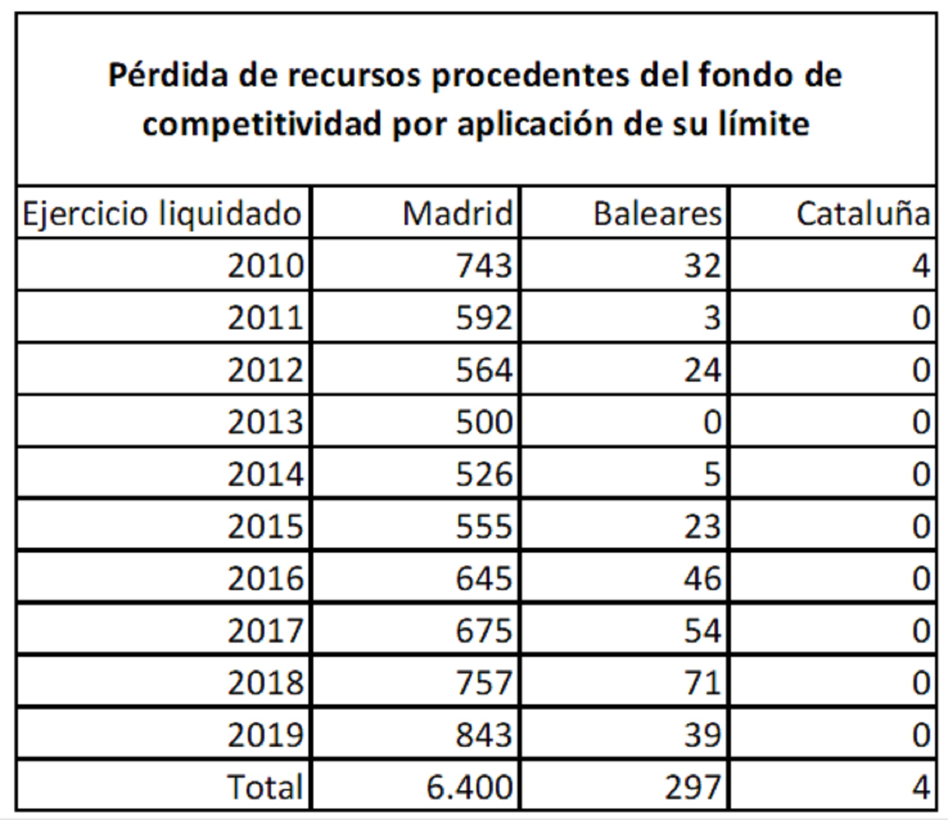Esa trampa contra Madrid hace que, en los diez años liquidados de manera definitiva del sistema (2009-2019), Madrid haya dejado de recibir entre 450 millones y 850 millones cada año, hasta sumar, en esa década, una pérdida de 6.400 millones de euros, frente a 297 millones de Baleares y solo cuatro millones de Cataluña, al principio, en 2010, cuando el límite estaba en 1,05. Al subir a 1,06 nunca más ha vuelto a perder nada por este concepto.