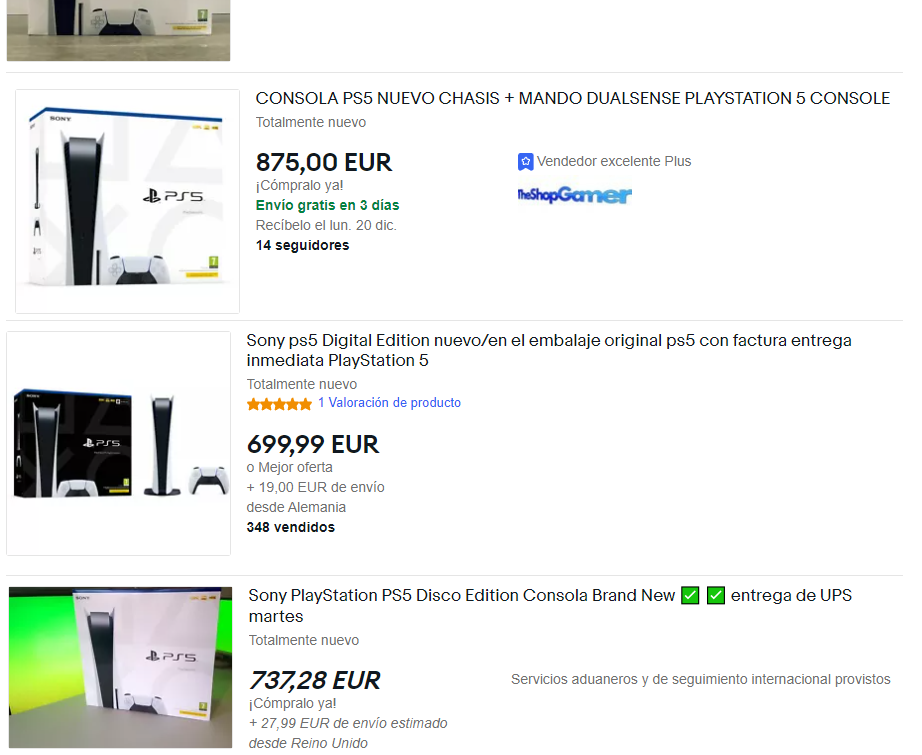 Ebay es otra página famosa por vender todo tipo de objetos. Del mismo modo, hemos mirado los precios de las Play Station 5 y rondan los 700-900 euros. Algo que beneficia a esta página es que, en vez de vender directamente el producto, pueden hacer pujas y hacer que el precio se dispare fácilmente.