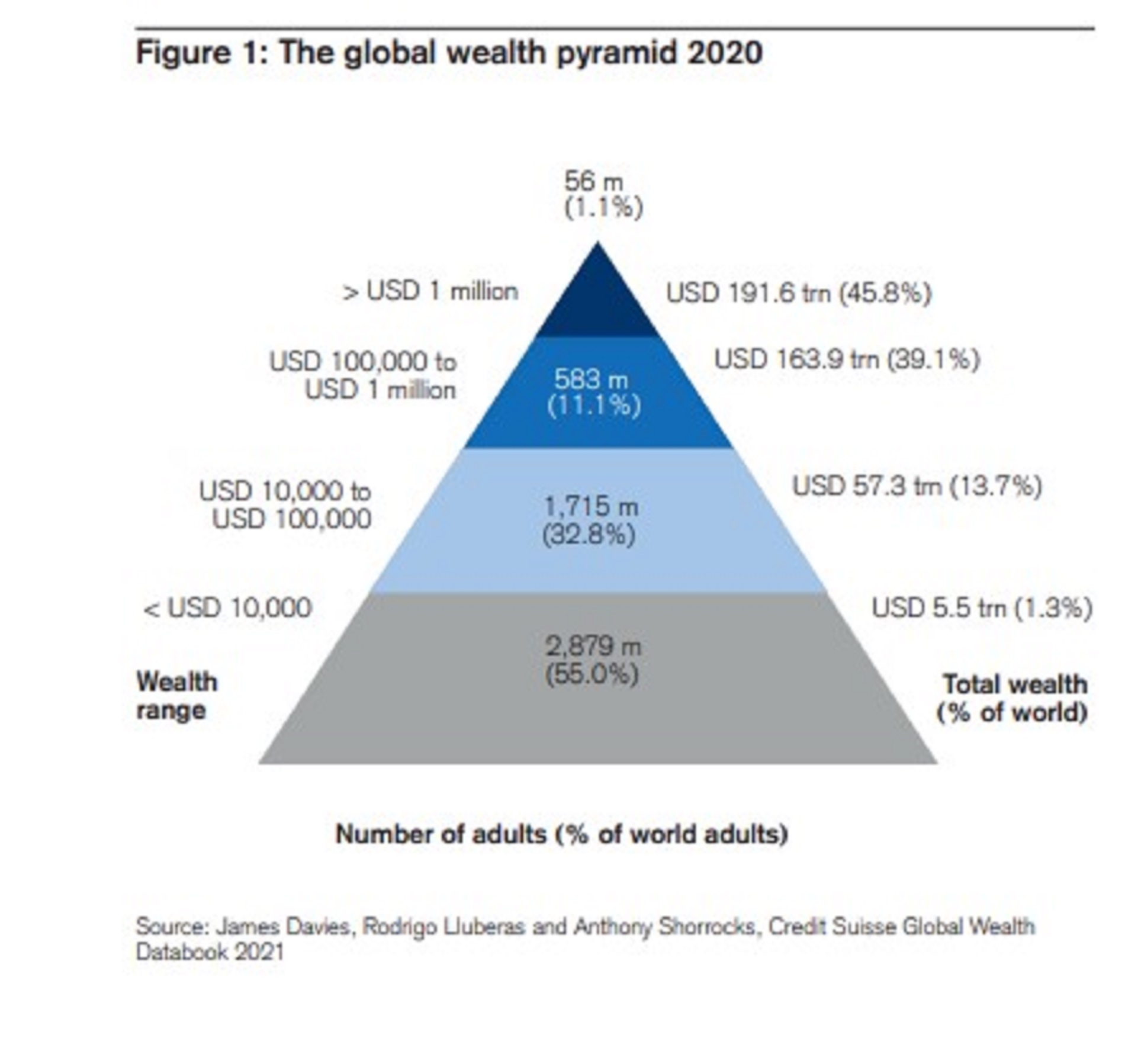 Tal y como nos muestra la pirámide, para estar en el 10% más rico del planeta se ha de tener un patrimonio neto de entre 100.000 dólares y 1.000.000 de dólares (unos 88.500 y 885.000 euros). No olvidemos que patrimonio no es lo mismo que ingresos, sino que se incluyen todas las propiedades que uno tenga —vivienda, automóvil, locales, planes de pensiones, inversiones, etc.—. Entonces, ¿quiénes se incluirían entre el 10% más rico del planeta?