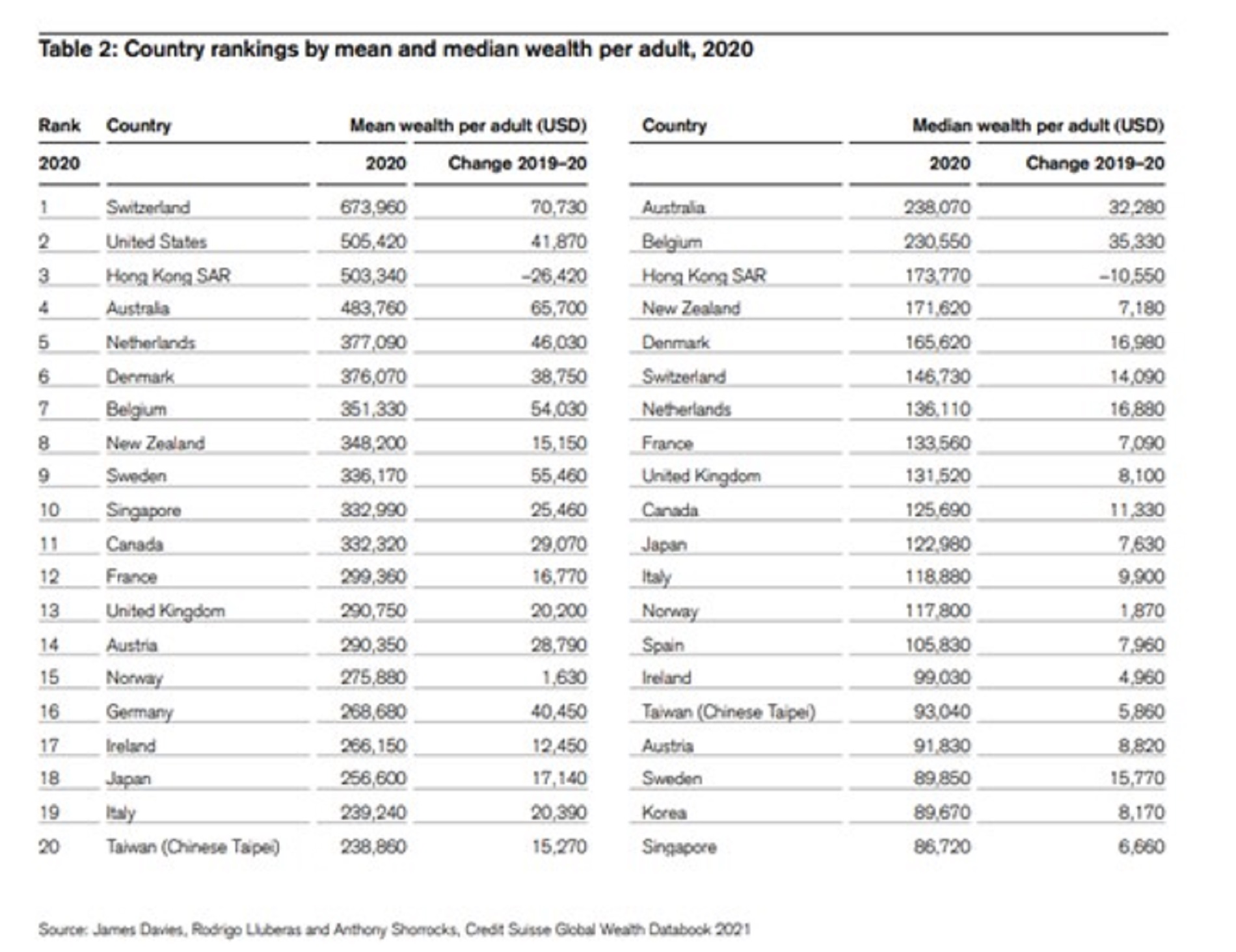 En todos estos países, la riqueza mediana se sitúa por encima de los 100.000 dólares. Es decir, la mitad de sus ciudadanos adultos tienen (al menos) un patrimonio de más de 100.000 dólares.