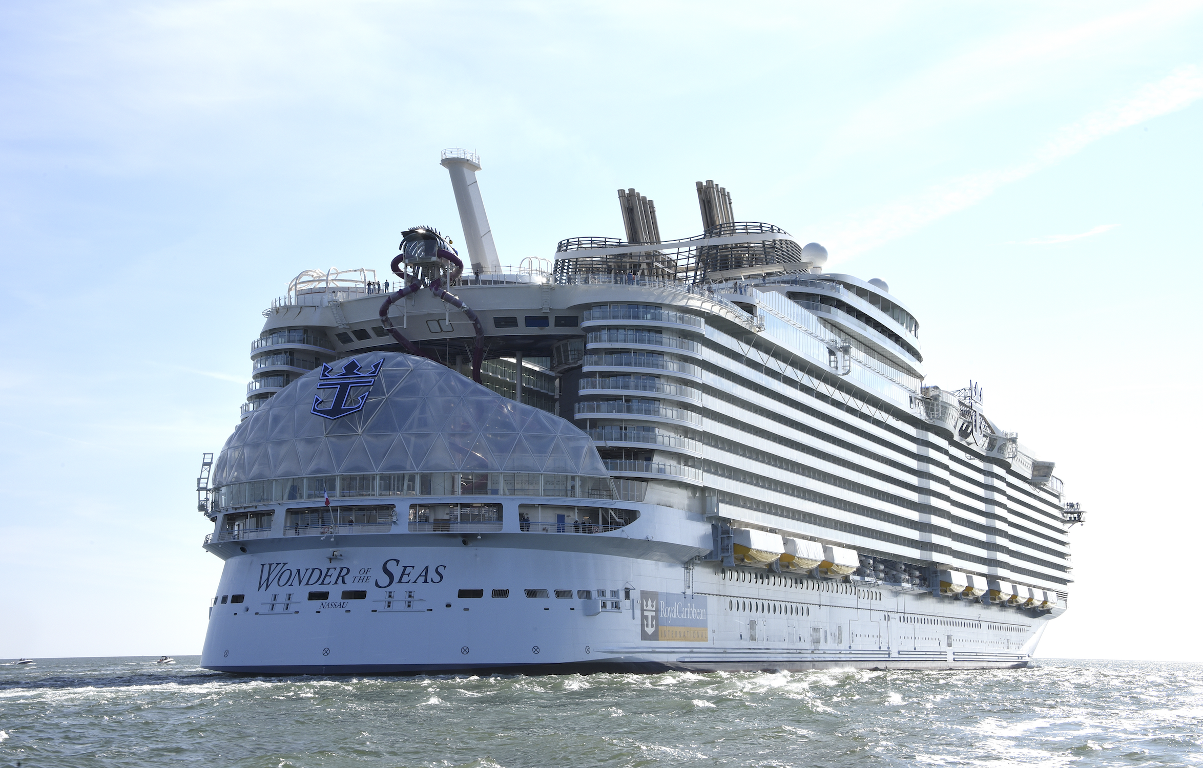 El Wonder of the Seas, el barco más grande del mundo y el primero en su clase que posee ocho vecindarios exclusivos, incluido el nuevo y lujoso Suite Neighborhood. Con capacidad para 6.800 pasajeros y 2.400 tripulantes, 12 cubiertas y 2.867 camarotes (100 más que el hasta ahora crucero más grande del mundo, el Symphony of the Seas).