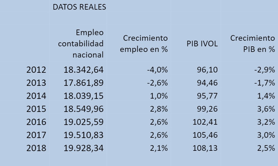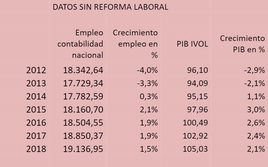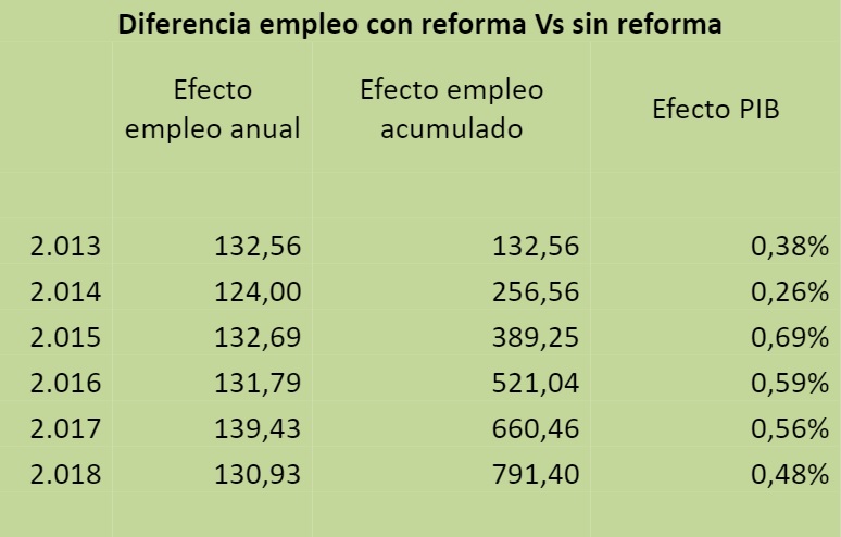 Sólo el efecto de la reforma de 2012, impulsó de manera directa entre 2012 y 2018 la creación de 800.000 empleos, como se puede comprobar en los cuadros siguientes del profesor Dr. Cortiñas, de la UNED (que recogen los datos reales del empleo en términos de Contabilidad Nacional, y la estimación del comportamiento que habría tenido el empleo de no haberse llevado a cabo la reforma de laboral de 2012), que con el efecto indirecto por mejora del entorno económico y expectativas se amplió hasta casi 3 millones de nuevos puestos de trabajo según el dato de afiliados a la Seguridad Social.
