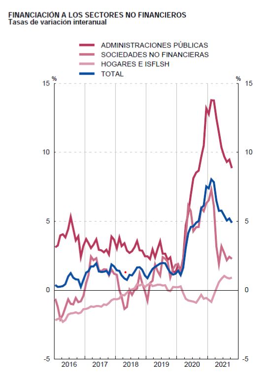 Esto, incluso en el período de mayor influencia de los bancos centrales y mayor liquidez en los mercados financieros de la historia, continúa estando vigente. Prueba de ello ha sido la tasa de crecimiento de los créditos al sector público y al sector privado en España durante los últimos años, con tasas de crecimiento de la financiación públicas que eran el doble que las privadas incluso en años de bonanza.