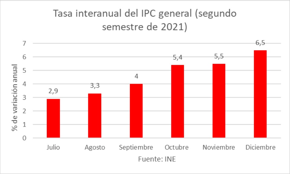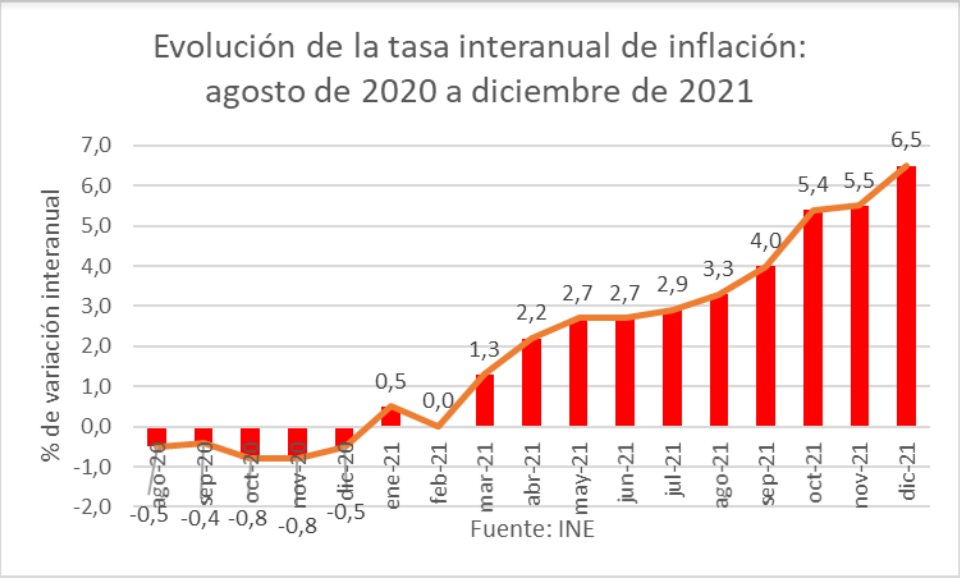 Así, desde noviembre del año pasado se está produciendo una escalada de la tasa anual de inflación, subiendo desde el -0,8% interanual de noviembre de 2020 hasta el 6,5% de este mes de diciembre, con un pequeño respiro que reflejó el índice en el pasado mes de febrero, donde se aplanó ese mes para crecer, al mes siguiente, 1,2 puntos, para continuar incrementándose en los meses restantes.