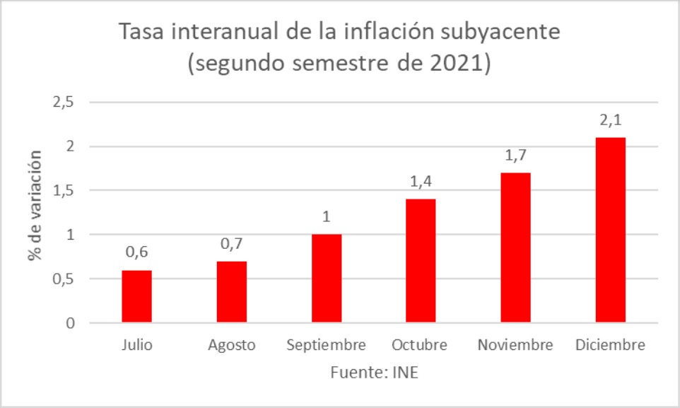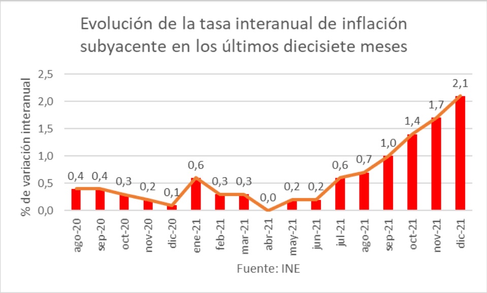 Sin duda, como decíamos, los precios de la energía son responsables de una parte importante del ascenso de los precios, pero esta subida se está dando ya de manera generalizada en todos los productos, como muestra el aumento de la inflación subyacente - que excluye los alimentos no elaborados y el componente energético: si en agosto crecía una décima, en septiembre crece otras tres, en octubre lo hacía en cuatro décimas, en noviembre otras tres, ahora lo hace en cuatro décimas, hasta el 2,1%. Es más, mientras que el dato definitivo del índice general es dos décimas menor al que marcaba el indicador adelantado, la subyacente confirma el dato anticipado en su momento, que muestra ya una mayor penetración del incremento de precios por todas las actividades.