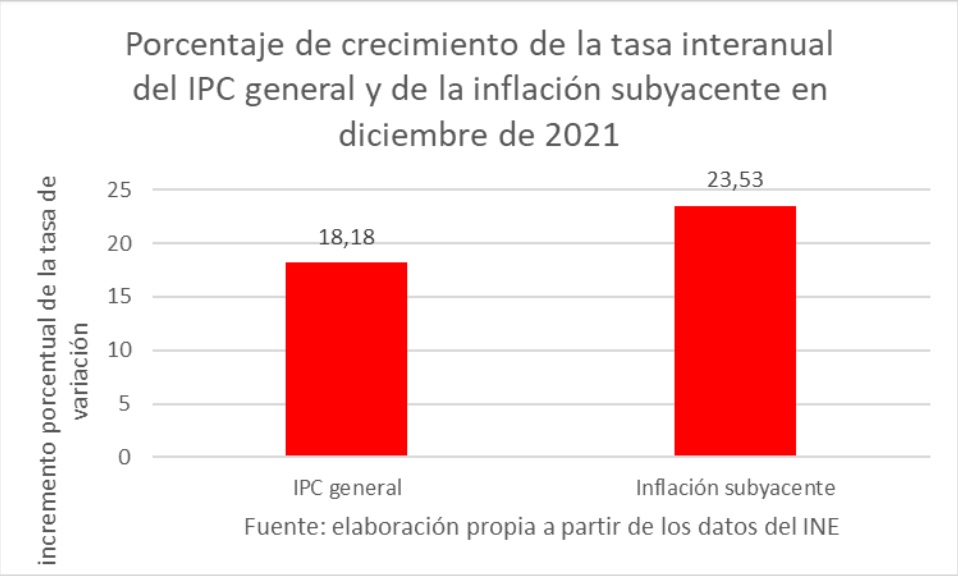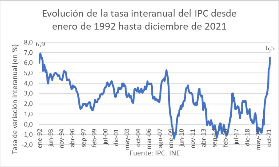 Hemos conocido el IPC de diciembre, que confirma el dato del indicador adelantado de finales de dicho mes, incrementa su tasa interanual en 1 punto respecto a la de noviembre y se sitúa en el 6,5% -con impacto importante en ella de los precios de la energía-, con una inflación subyacente -que excluye los alimentos no elaborados y el componente energético- que se incrementa tres décimas, hasta el 2,1%. La tasa mensual del índice general de precios sube también de manera importante, nada menos que 1,2 puntos. Pese a que el dato definitivo del IPC es dos décimas menor que el indicador adelantado, la tendencia alcista es constante y su crecimiento exponencial.