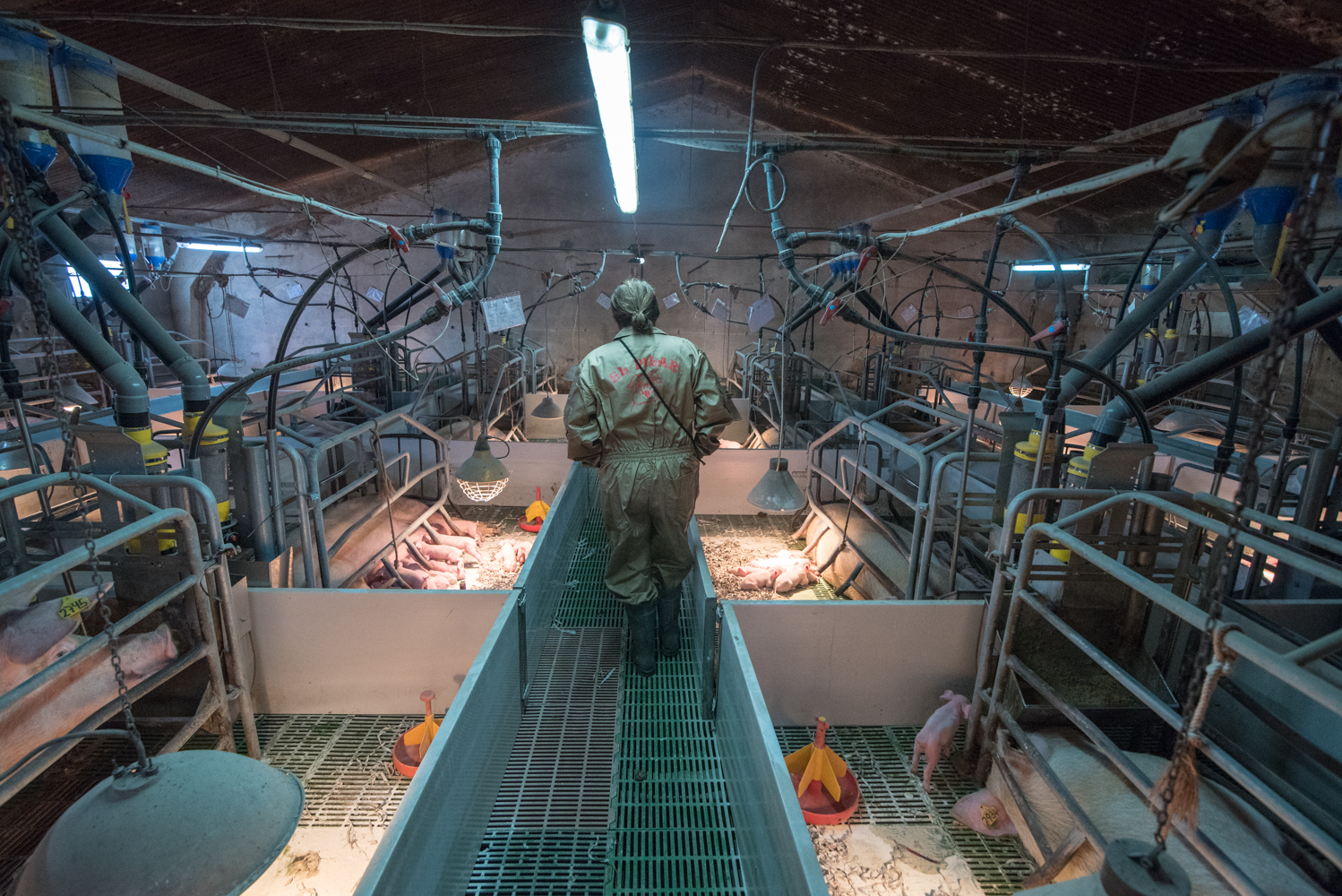A ambos lados de un largo pasillo hay filas de corrales en los que unas diez hembras están apaciblemente tumbadas o comiendo en tolvas individuales.