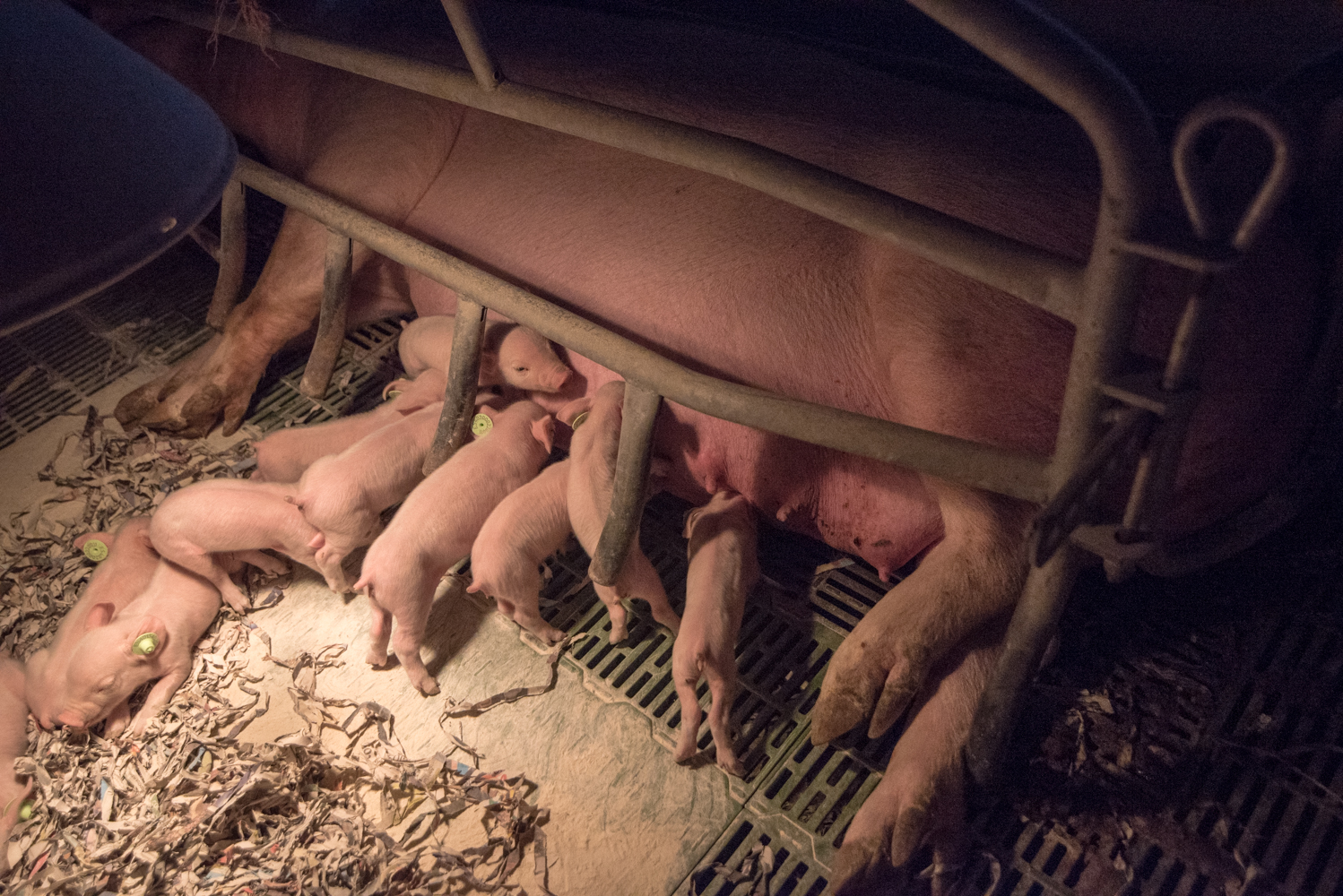 La sala tiene una iluminación cálida y una temperatura constante de 25 grados, garantizada incluso si hay un corte de luz gracias al grupo electrógeno de la granja. Las hembras duermen junto a sus lechones, unos ocho o diez por camada. "¿Tú crees que estos cerdos están maltratados?", pregunta susurrando Conde para evitar alterar a los recién nacidos. Las hembras que están a punto de parir pasan una media de 28 días separadas del resto de la piara en corrales individuales con movilidad reducida para evitar que aplasten o pisen sin querer a los lechones recién nacidos. Durante ese tiempo, pueden consumir toda la comida y el agua que deseen con solo pulsar un botón.