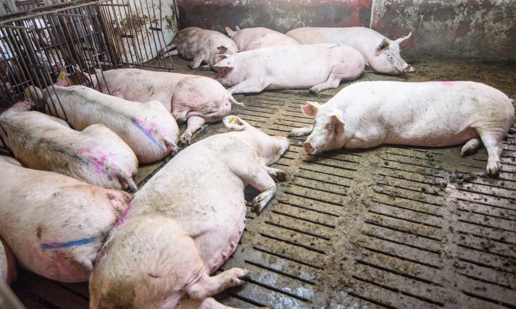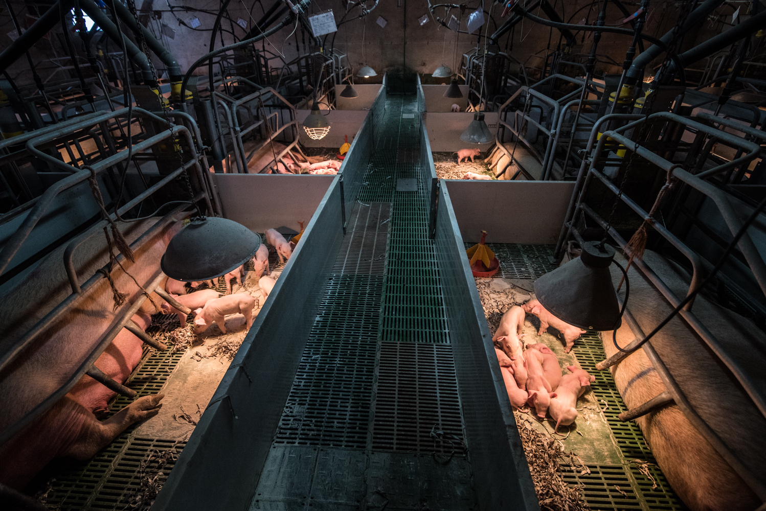 Después de prepararnos, el recorrido comienza en la sala de cerdas preparadas para inseminar. A ambos lados de un largo pasillo hay filas de corrales en los que unas diez hembras están apaciblemente tumbadas o comiendo en tolvas individuales. Bajo sus pezuñas, un suelo de rejilla filtra los excrementos, lo que permite mantener el espacio bastante limpio teniendo en cuenta que estamos en una pocilga. Las hembras están limpias y parecen saludables.