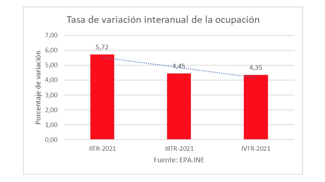 Así, la tasa interanual de creación de empleo va perdiendo fuerza: pasa del 5,72% en el segundo trimestre de 2021 al 4,35% en el cuarto.