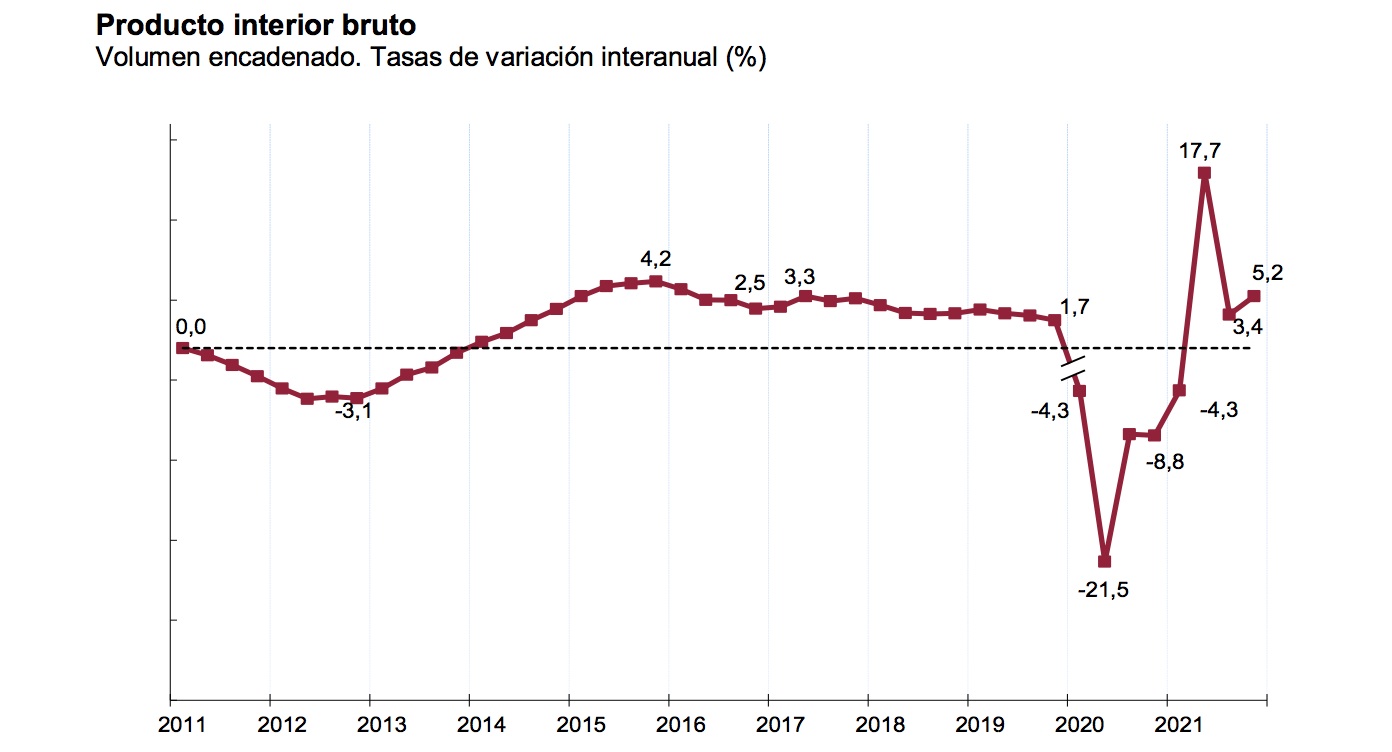 La contabilidad nacional adelantada por el INE también revela que el crecimiento de la actividad en el cuarto trimestre de 2021 fue del 2%, seis décimas menos que en el trimestre previo y un dato decepcionante.