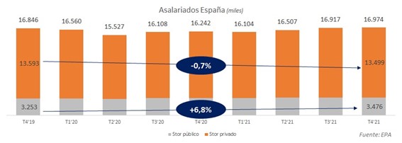 El empleo privado no ha recuperado los niveles prepandemia. Hay 95.000 asalariados menos en el sector privado que hace 2 años, y si añadimos los autónomos (trabajadores por cuenta propia) tampoco se recuperan los niveles pre-crisis en el sector privado.