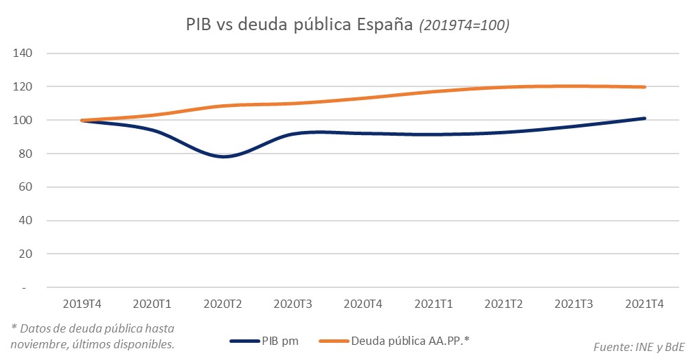 Para superar la pandemia del Covid 19 nuestro país se ha tenido que endeudar por una cuantía que asciende a casi 240.000 millones de euros hasta noviembre (último dato conocido). Y, sin embargo, el PIB apenas ha crecido en 4.000 millones de euros en los últimos 2 años.