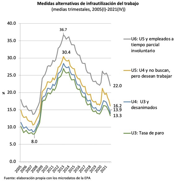 En definitiva, los datos de la EPA no son tan buenos como nos hacen creer, están muy maquillados e inflados con empleo público, y, aún así, tenemos una tasa de paro inaceptablemente alta. Si midiéramos esta variable como en Estados Unidos llegaría al 22%. Vean este gráfico del Profesor Felgueroso, investigador de FEDEA.