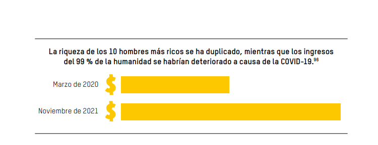 Por otro lado, la ONG Intermón Oxfam publicó, coincidiendo con la Agenda de Davos, el informe "Las desigualdades matan", mediante el cual denuncia que la riqueza de los diez hombres más ricos del planeta se ha duplicado, mientras que los ingresos del 99 % de la humanidad se han deteriorado a causa de la covid.
