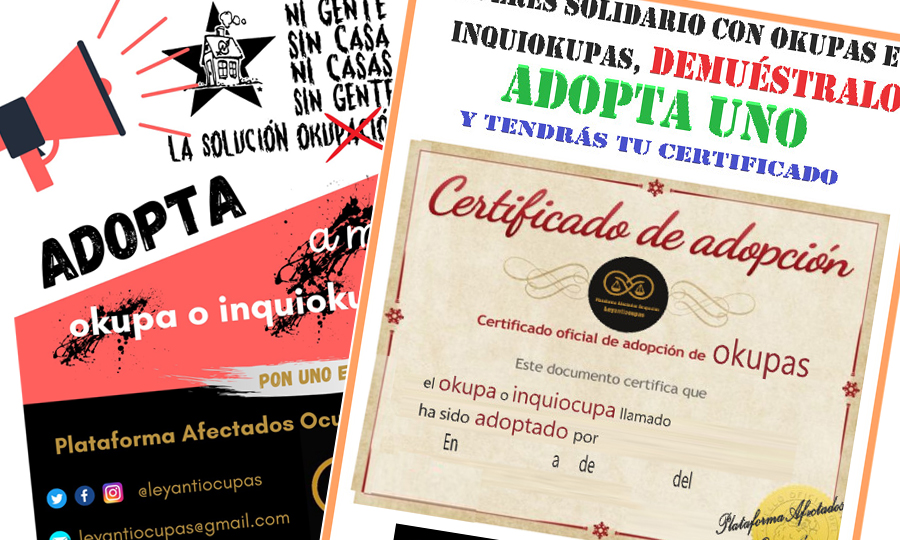 Bajo el hastag #AdoptaaMiOcupa, la Plataforma de Afectados por la Ocupación ha puesto en marcha una provocadora campaña con la que pretende poner de manifiesto la hipocresía de la izquierda con este asunto. "¿Eres de los que piensa que todos los okupas son vulnerables? ¿Crees que la okupación es un derecho? ¿Estás seguro/a de que tras la okupación hay una campaña orquestada por las compañías de alarmas? Si es así, y te consideras una persona solidaria, los okupas te necesitan -reza el documento promovido por las víctimas de esta lacra-. Tenemos un gran stock y prevemos un gran abastecimiento en las próximas semanas y meses".