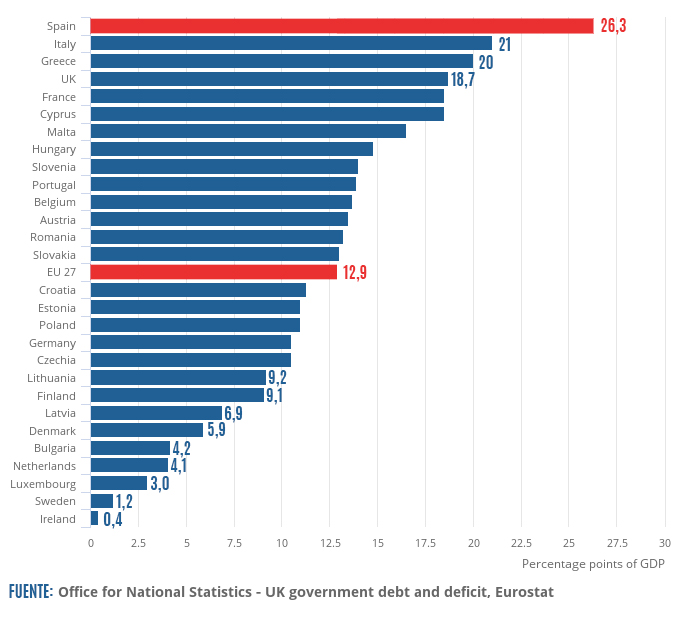 Las cifras que recoge Eurostat refleja el incremento de deuda pública experimentada por los distintos países del continente desde el tercer trimestre de 2019 hasta finales del tercer trimestre de 2021. España es, de manera indiscutible, el país que con más intensidad vio crecer su deuda pública, con 26,3 puntos porcentuales más en dos años.